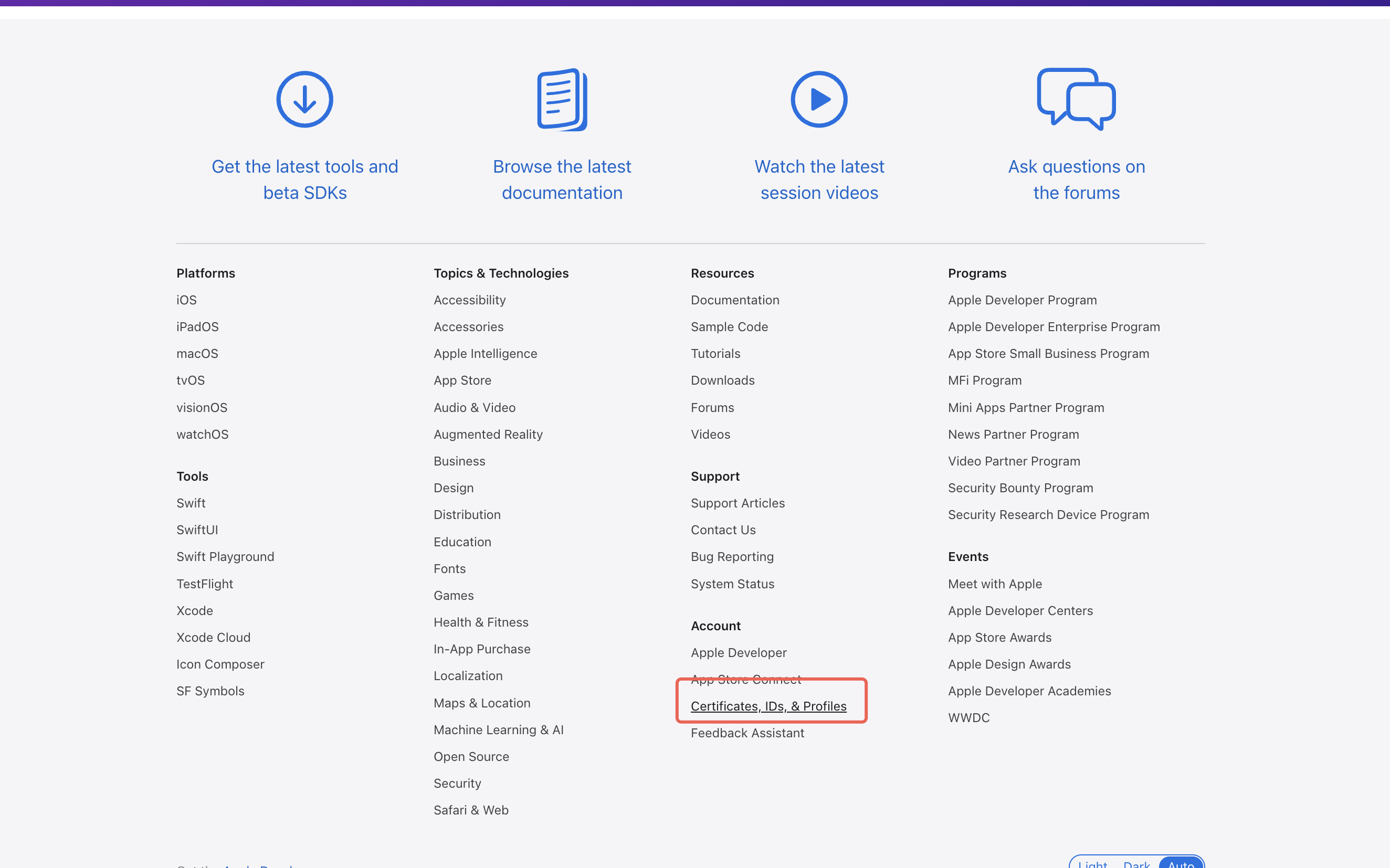 1. 登录 苹果开发者中心 网站,单击 Certificates, IDs & Profiles 选项卡,进入 Certificates, Identifiers & Profiles 页面。