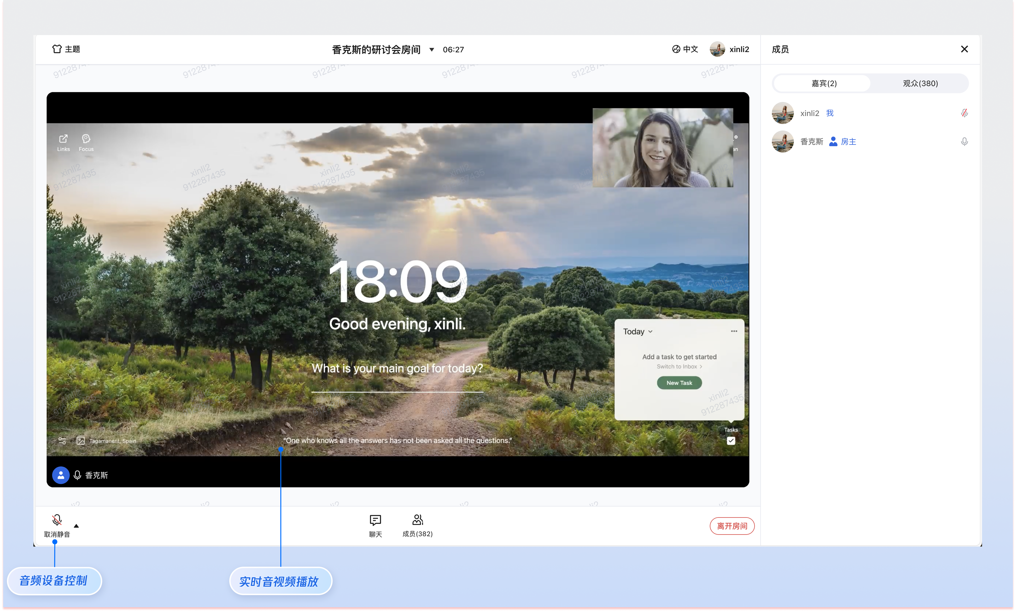 研讨会(Webinar):专为大型直播演讲设计,支持无上限观众进房观看。观众可举手申请上台成为嘉宾后参与讨论,且系统针对万人级互动场景优化了消息并发性能,满足更专业的演讲互动需求。