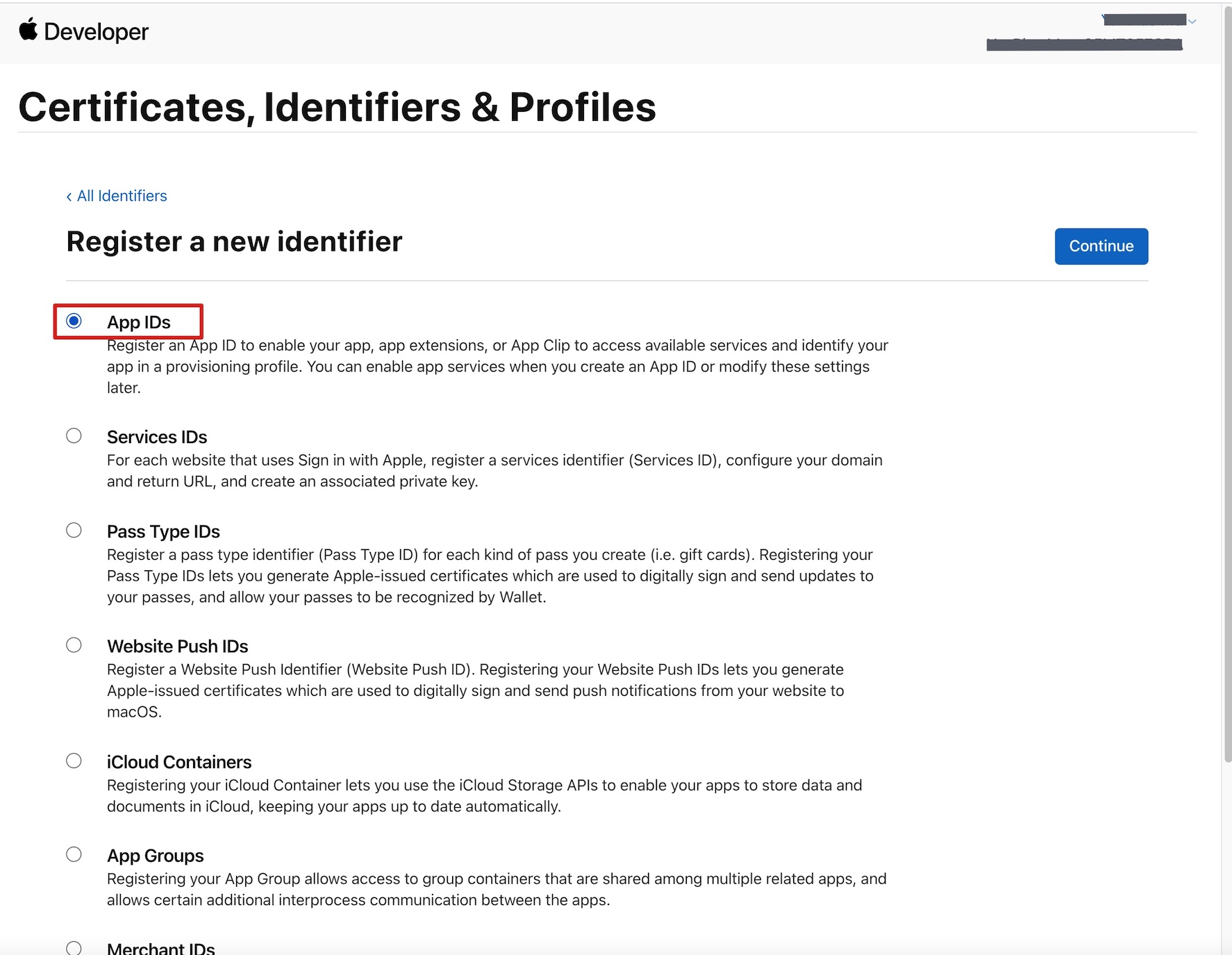 Bundle ID 不能使用通配符 *,否则将无法使用远程推送服务。4. 勾选 App IDs,单击 Continue 进行下一步。
