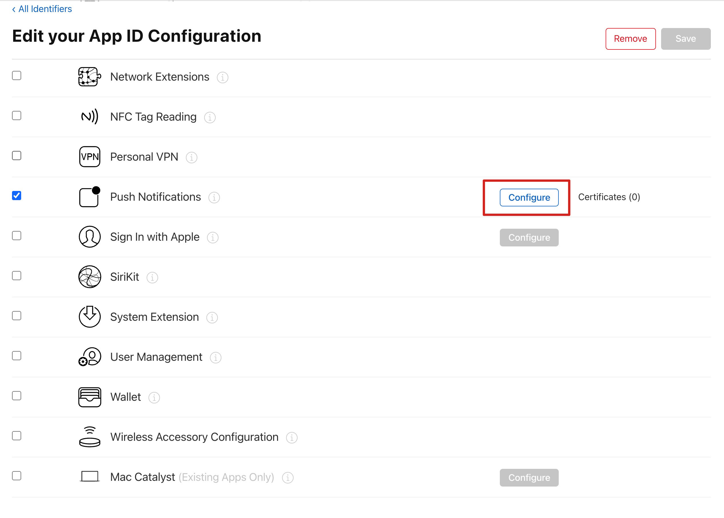 7. 勾选 Push Notifications,开启远程推送服务。