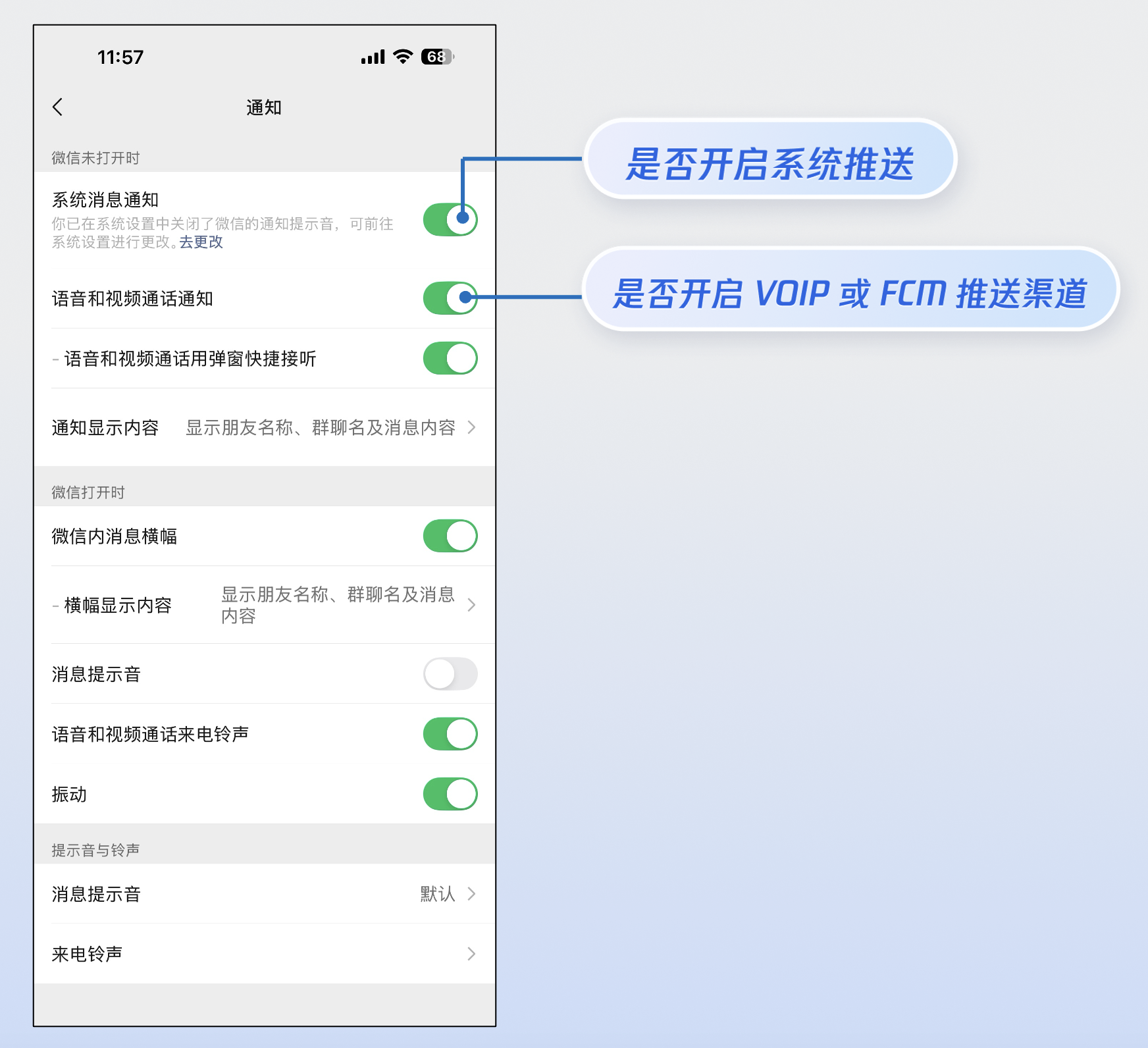 2. 提供精细控制:借鉴微信等优秀应用的做法,在应用设置内为用户提供独立的开关,分别控制 Notification 和 FCM Data Message,而非引导用户去系统设置中一刀切地关闭所有通知。