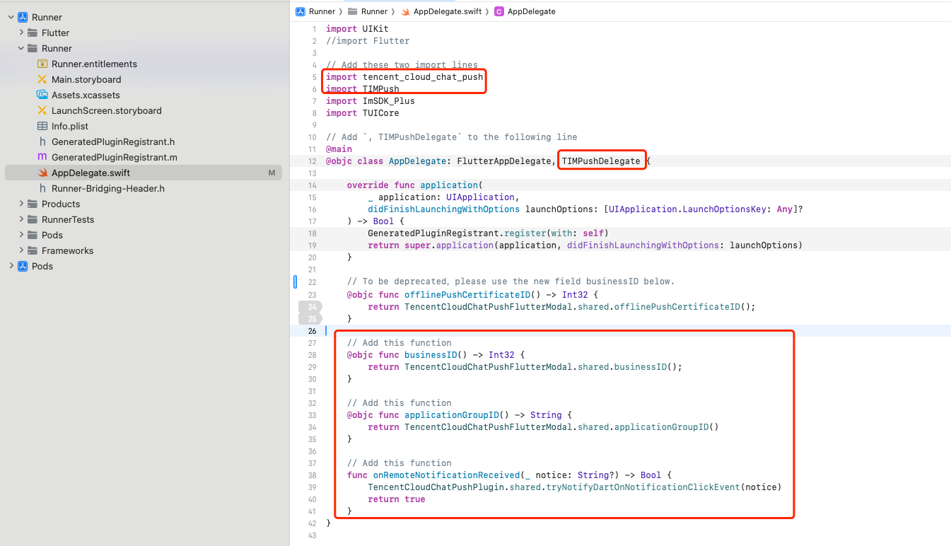 import UIKitimport Flutter// Add these two import linesimport TIMPushimport tencent_cloud_chat_push// Add `, TIMPushDelegate` to the following line@UIApplicationMain@objc class AppDelegate: FlutterAppDelegate, TIMPushDelegate {override func application(_ application: UIApplication,didFinishLaunchingWithOptions launchOptions: [UIApplication.LaunchOptionsKey: Any]?) -> Bool {GeneratedPluginRegistrant.register(with: self)return super.application(application, didFinishLaunchingWithOptions: launchOptions)}// To be deprecated,please use the new field businessID below.@objc func offlinePushCertificateID() -> Int32 {return TencentCloudChatPushFlutterModal.shared.offlinePushCertificateID();}// Add this function@objc func businessID() -> Int32 {return TencentCloudChatPushFlutterModal.shared.businessID();}// Add this function@objc func applicationGroupID() -> String {return TencentCloudChatPushFlutterModal.shared.applicationGroupID()}// Add this function@objc func onRemoteNotificationReceived(_ notice: String?) -> Bool {TencentCloudChatPushPlugin.shared.tryNotifyDartOnNotificationClickEvent(notice)return true}}
