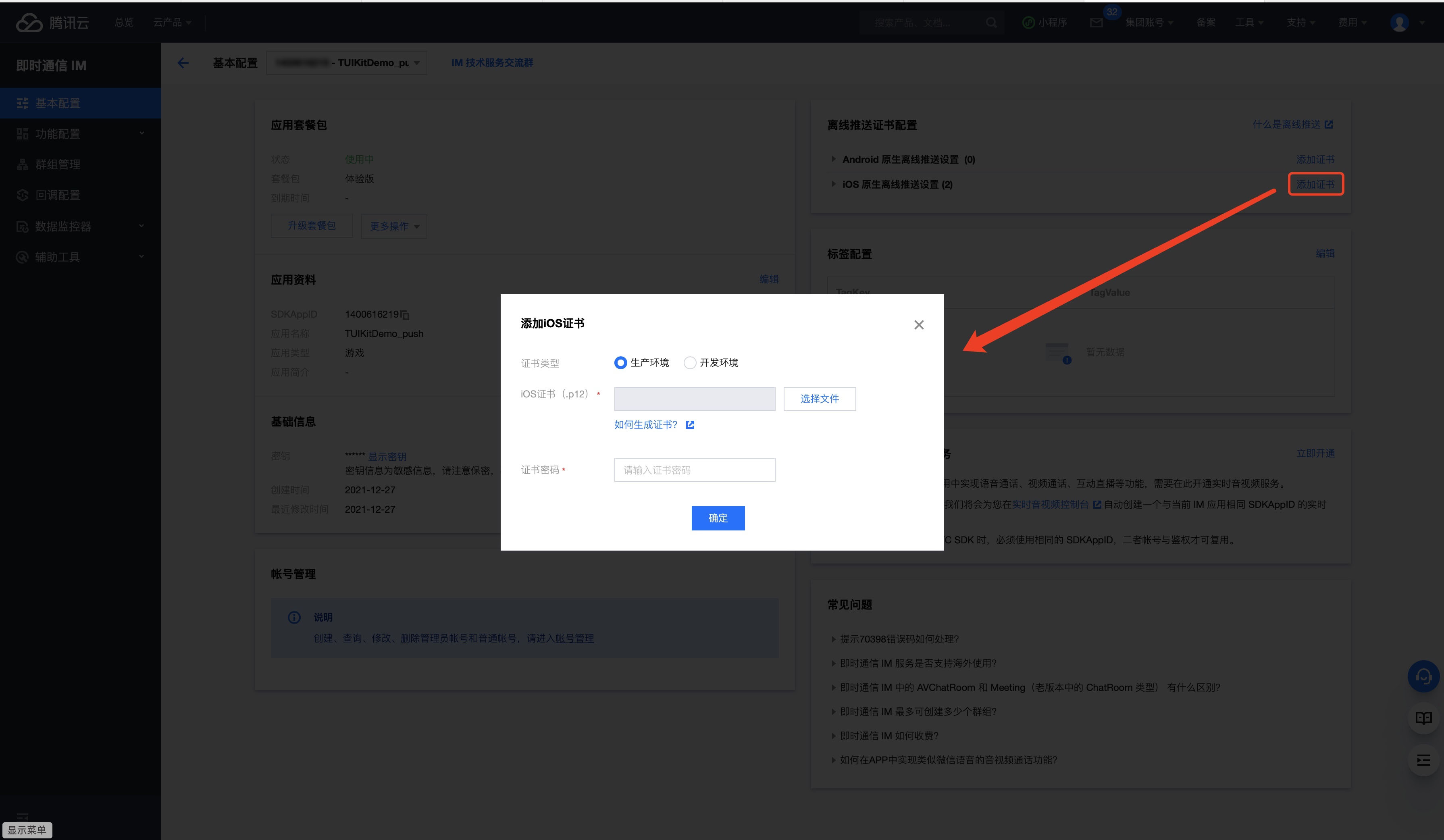 3. 单击 iOS 原生离线推送设置右侧的添加证书。