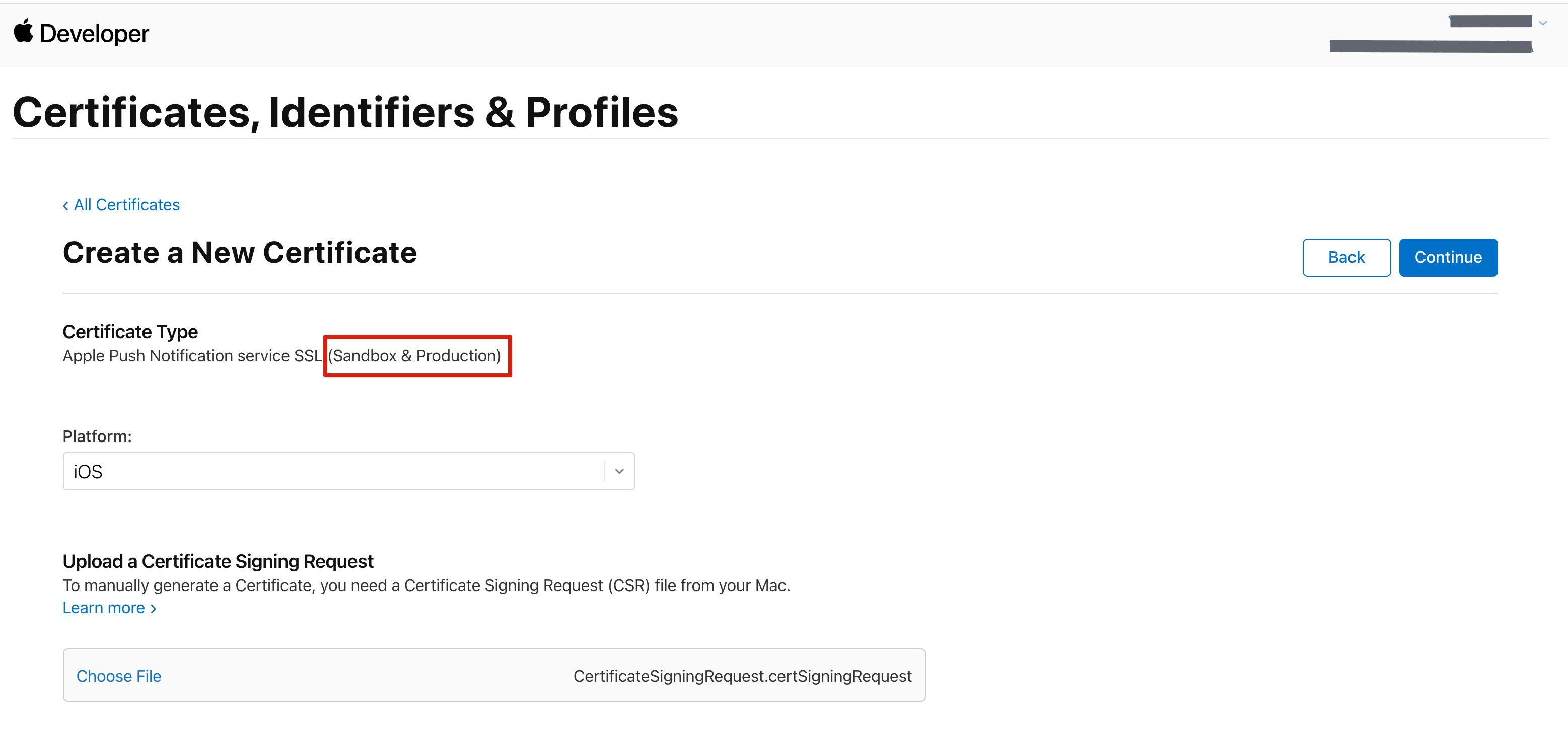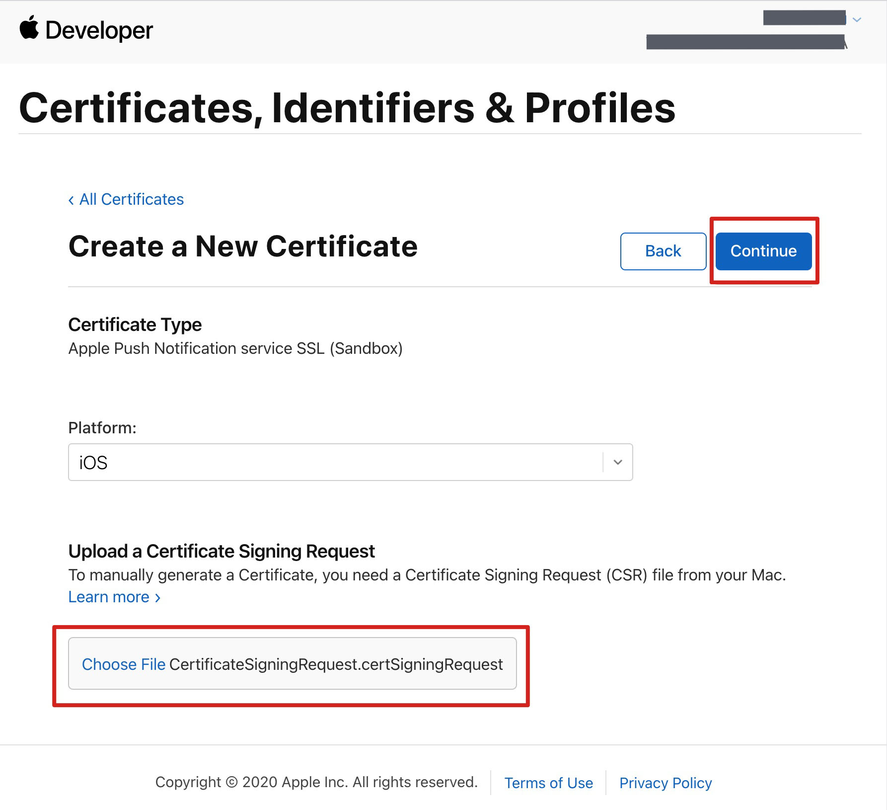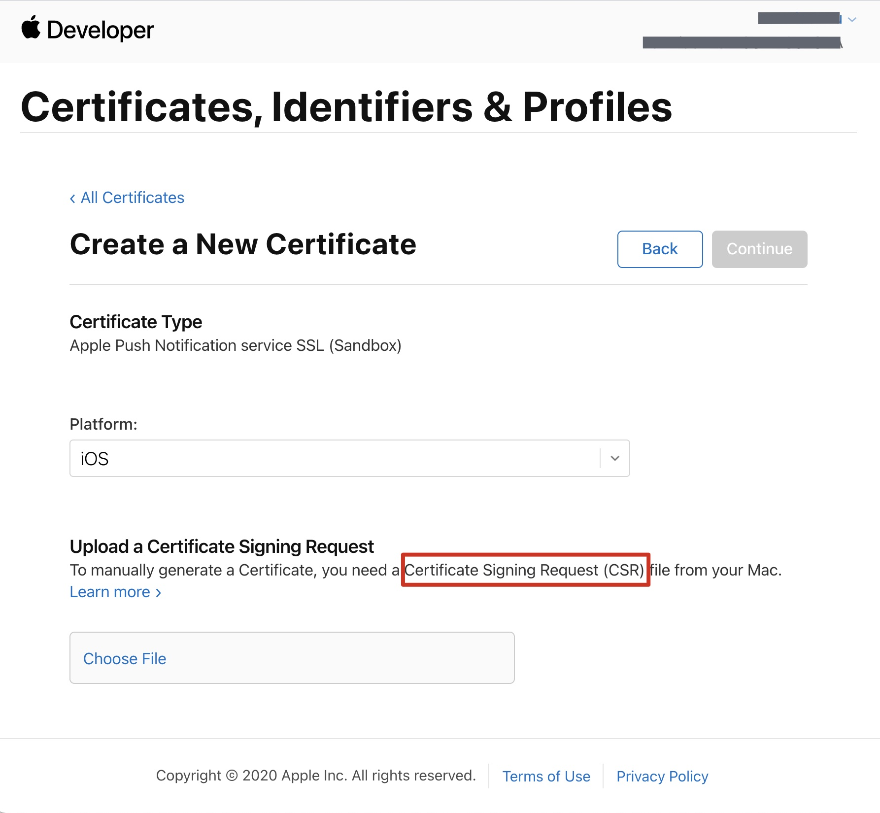 6. 返回上述 步骤3 中 Apple Developer 网站刚才的页面,单击 Choose File 上传生成的