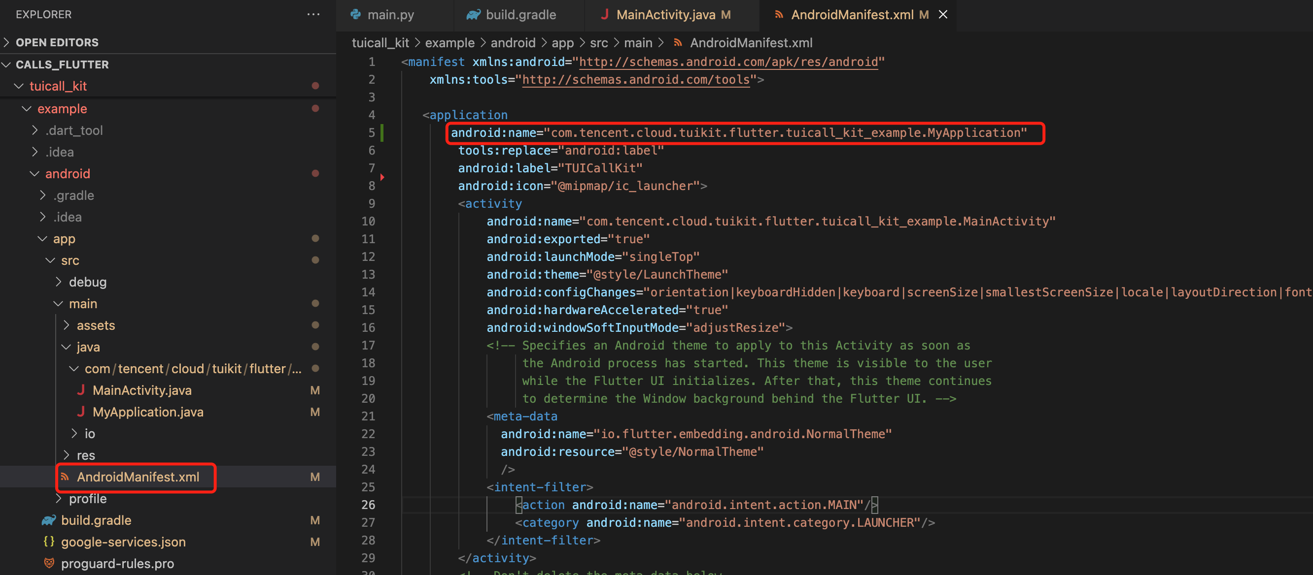 android/app/src/main/AndroidManifest.xml 文件,为 <application> 标签,新增指定一个 android:name 参数即可,指向刚制作的自定义 Application 类。如图所示: