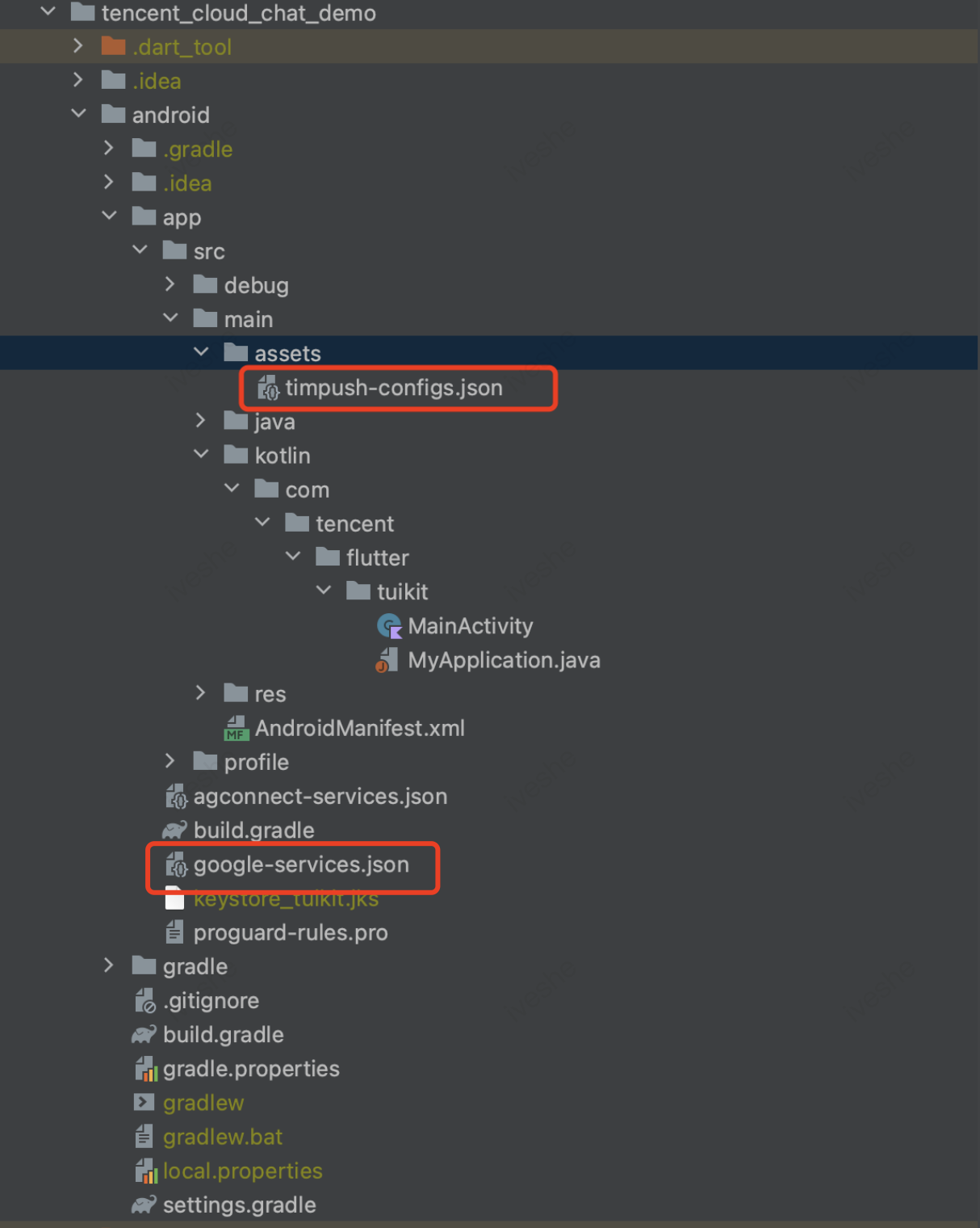 timpush-configs.json 文件添加到应用模块的 assets 目录下,将 google-services.json 添加到工程 app 目录下。选择下载配置文件 timpush-configs.json | 下载文件 google-services.json | 添加到工程 |