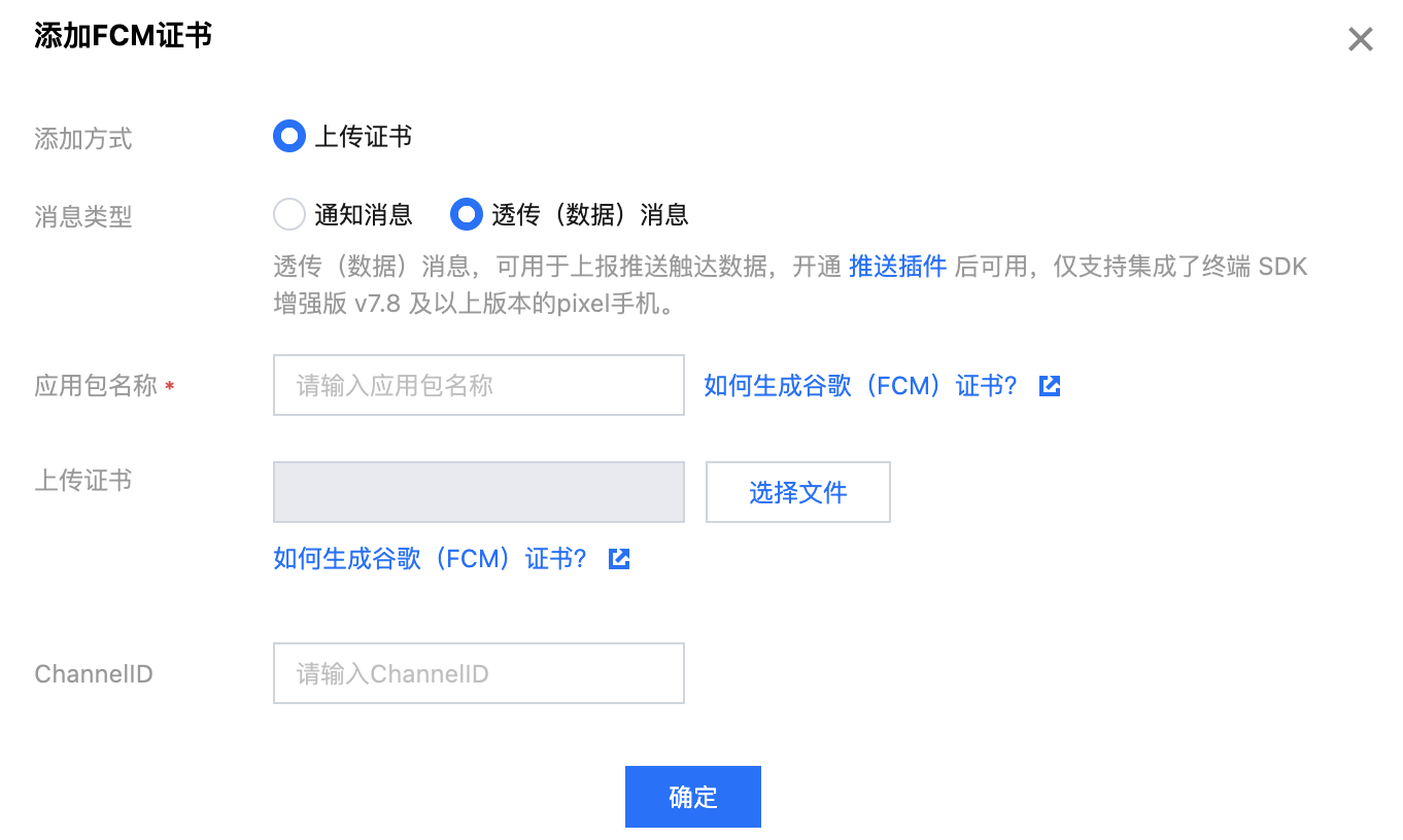 录 即时通信 IM 控制台,在推送管理 > 接入设置功能栏,选择 FCM,添加 FCM 的证书,其中,消息类型选择透传(数据)消息。厂商推送平台 | IM 控制台配置 |