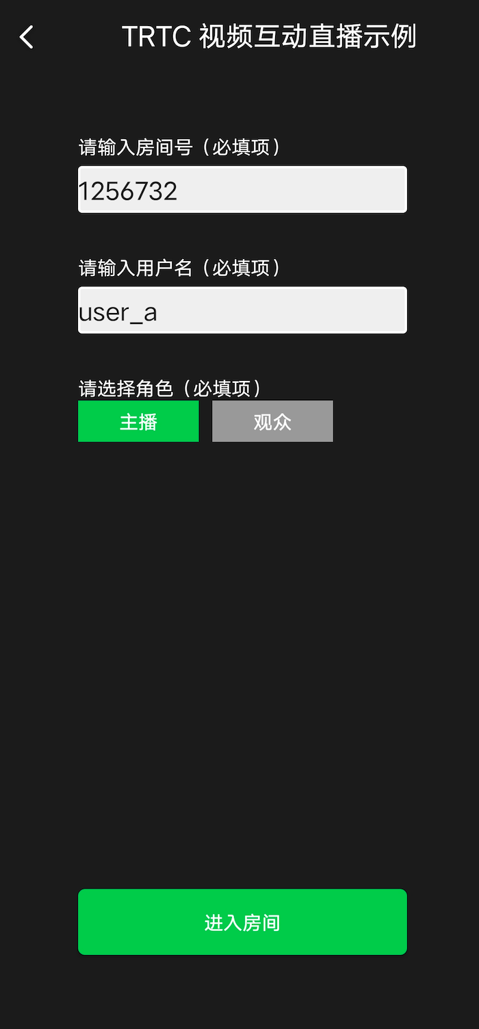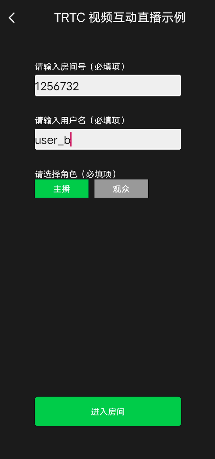 1. 进入应用后,点击视频互动直播,设备 A 和设备 B 输入相同的房间号和不同的用户名,并点击进入房间,如下图示: