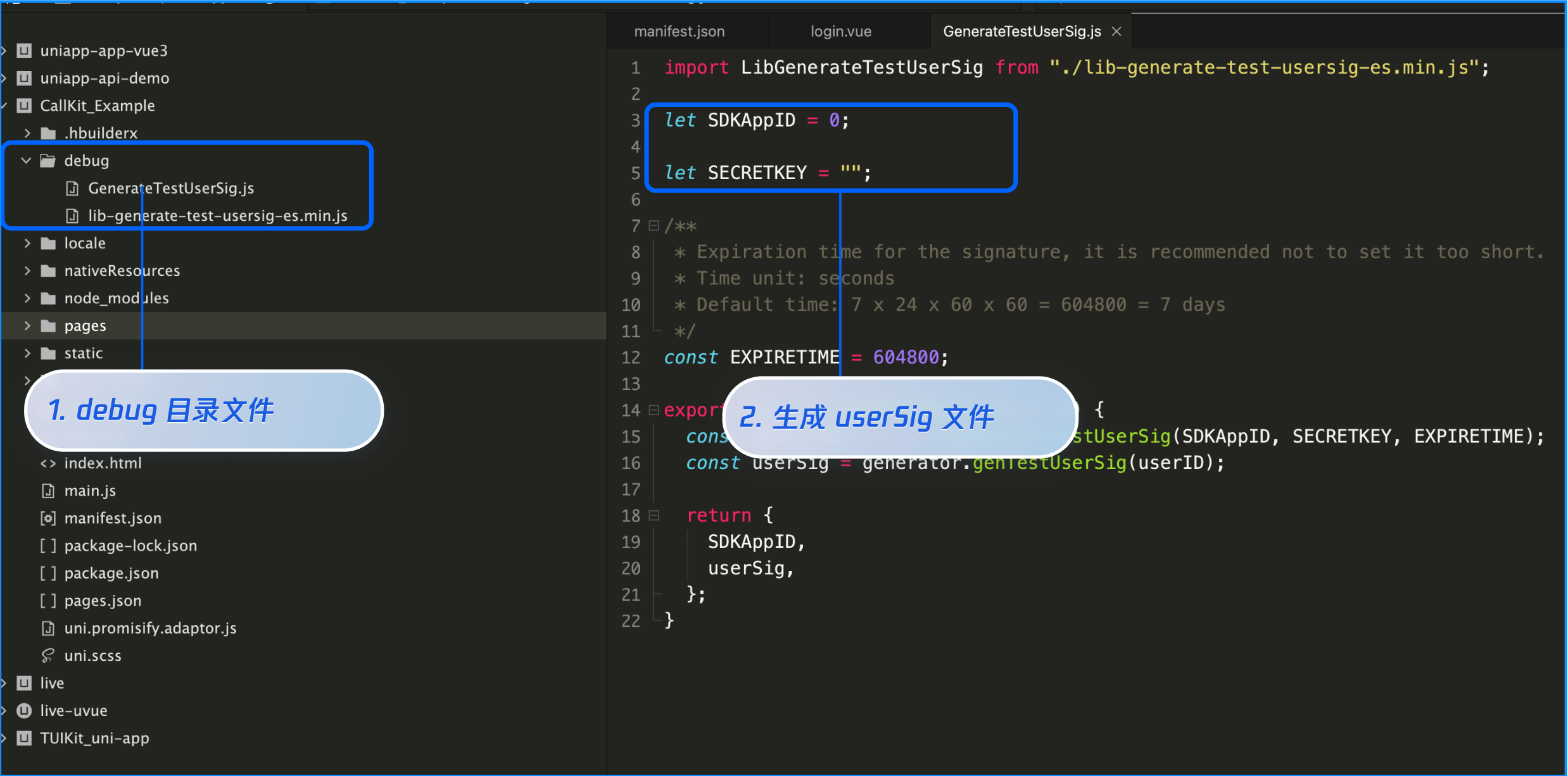 // 引入本地生成 UserSig 的工具(仅供开发调试)import { genTestUserSig } from '../../debug/GenerateTestUserSig.js';const TUICallKit = uni.requireNativePlugin('TencentCloud-TUICallKit');// 生成用户签名const { userSig, SDKAppID } = genTestUserSig('denny');uni.$TUICallKit = TUICallKit;// 登录uni.$TUICallKit.login({SDKAppID: 123456, // 替换为您的 SDKAppIDuserID: 'denny', // 替换为您的用户 IDuserSig: 'xxx', // 替换为您生成的 userSig})