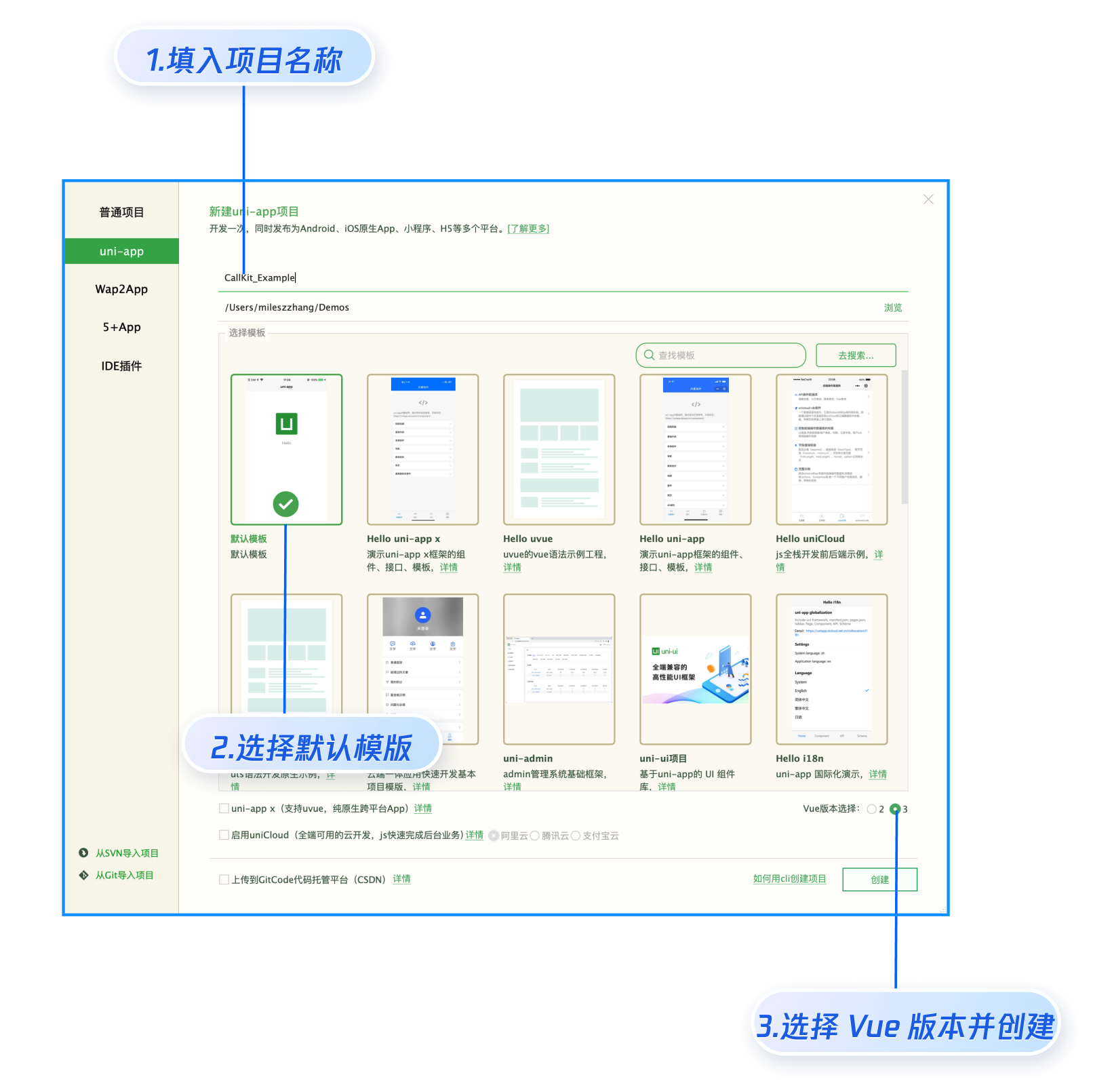 打开 HBuilderX 开发工具,点击新建 uni-app 项目,填入项目名称,选择默认模板以及 Vue 版本并创建项目。