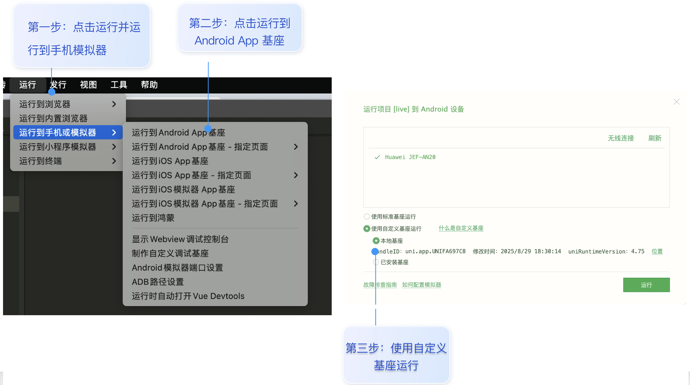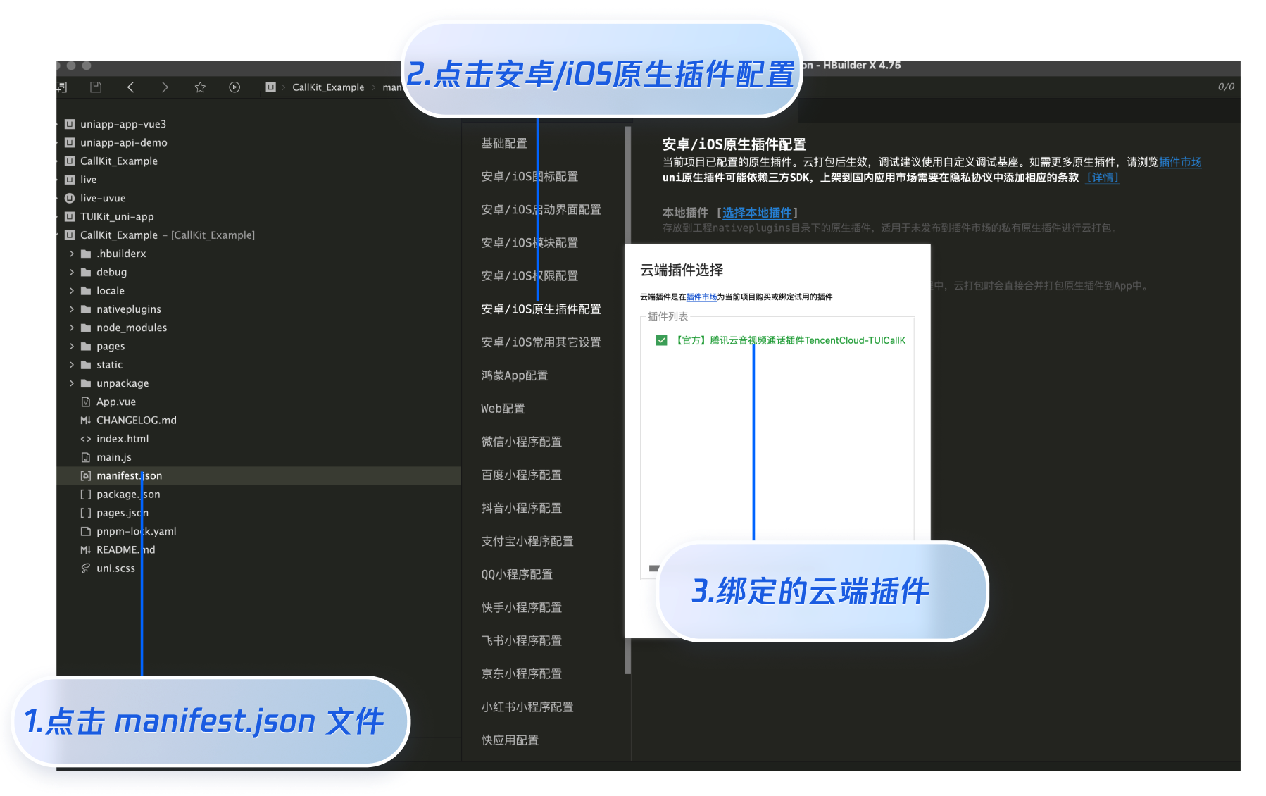 完成上述步骤后,您已经得到了一个完整的音视频通话项目。由于此插件依赖原生的音视频能力,为了确保所有功能可以正常调用和调试,您需要采用传统打包方式,来制作和运行一个自定义调试基座。