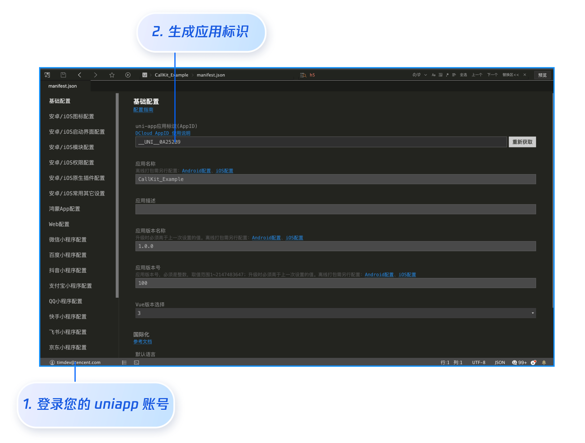 打开 HBuilderX,点击左下角登录 uni-app 账号(无账号请先注册)。完成登录后,点击项目的 manifest.json 文件,生成 uni-app 应用标识(AppID)。