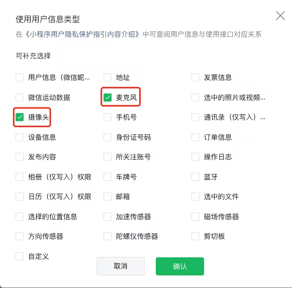 登录小程序控制台更新隐私保护政策,勾选麦克风、摄像头。