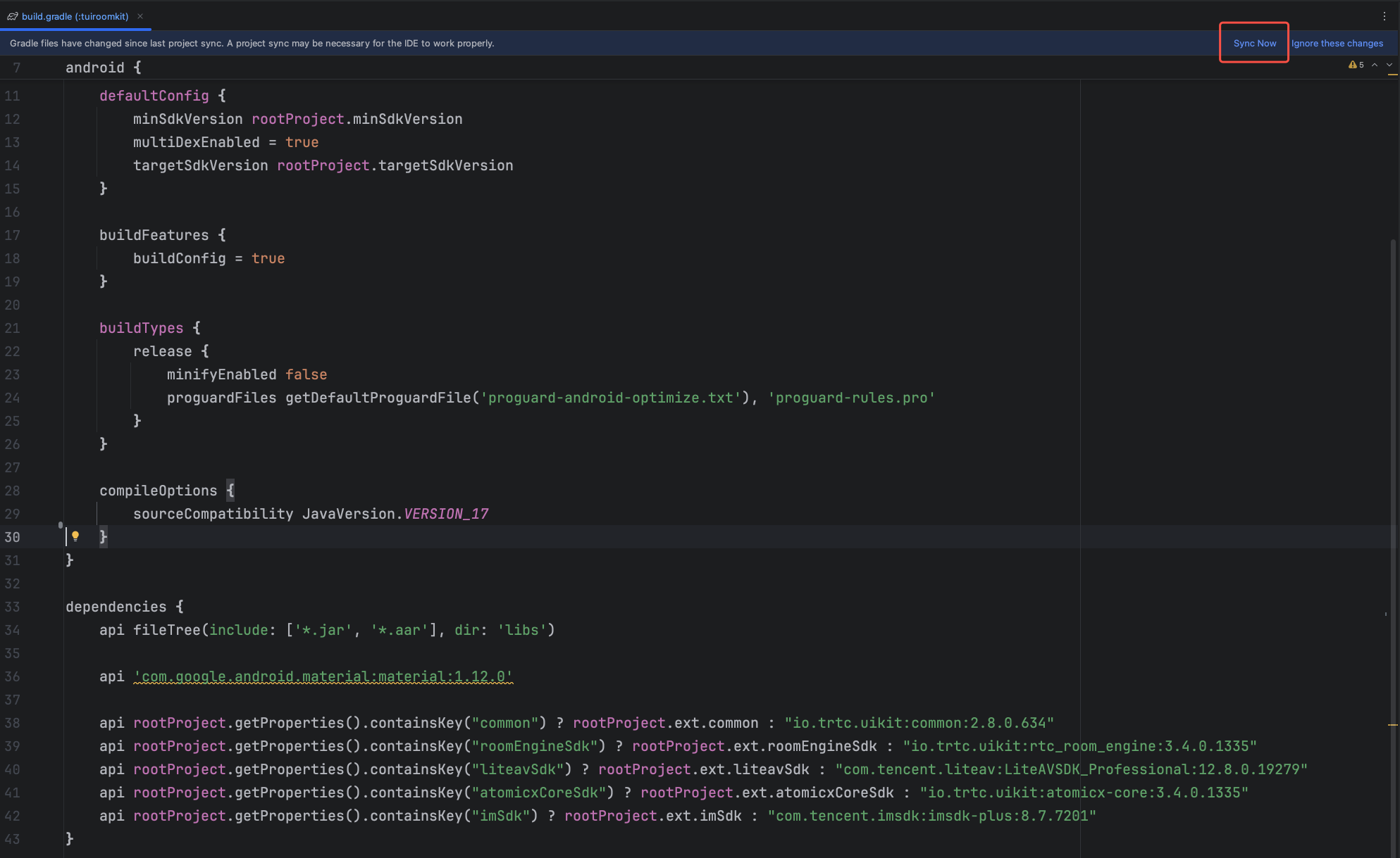 在您完成上述步骤后,通常情况下 Android Studio 会自动为您弹出 Sync Now 按钮,您需要点击该同步按钮完成项目的同步,若 IDE 没有自动弹出同步按钮,请您手动点击工具栏中的同步按钮进行项目的同步,同步后 IDE 会完成项目的构建配置和索引等工作,您就可以在您的项目中正常使用 TUIRoomKit 组件了。