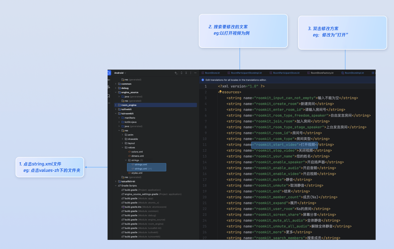 TUIRoomKit 使用 Android 通用的 XML 资源文件来管理 UI 所需的文案显示,您可以直接通过