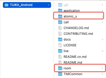 settings.gradle.kts 或 settings.gradle 文件中,增加以下代码以导入 tuiroomkit 组件。include(":tuiroomkit")project(":tuiroomkit").projectDir = File(settingsDir, "room/tuiroomkit")include(":atomic")project(":atomic").projectDir = File(settingsDir, "atomic_x")