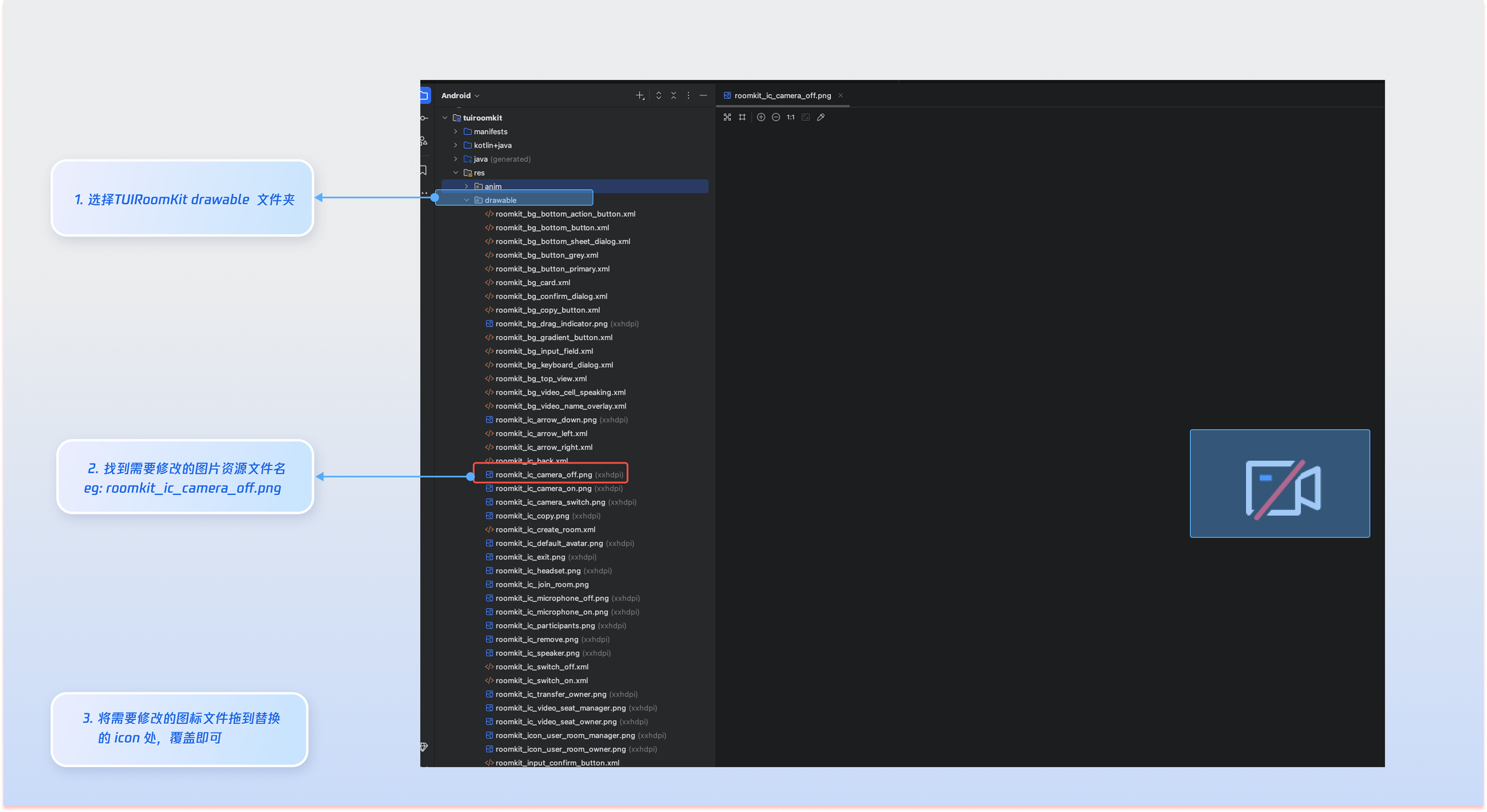 TUIRoomKit组件后,开发者可以根据实际 UI 交互需求直接替换组件下的图标资源, 以适配开发者的业务场景。