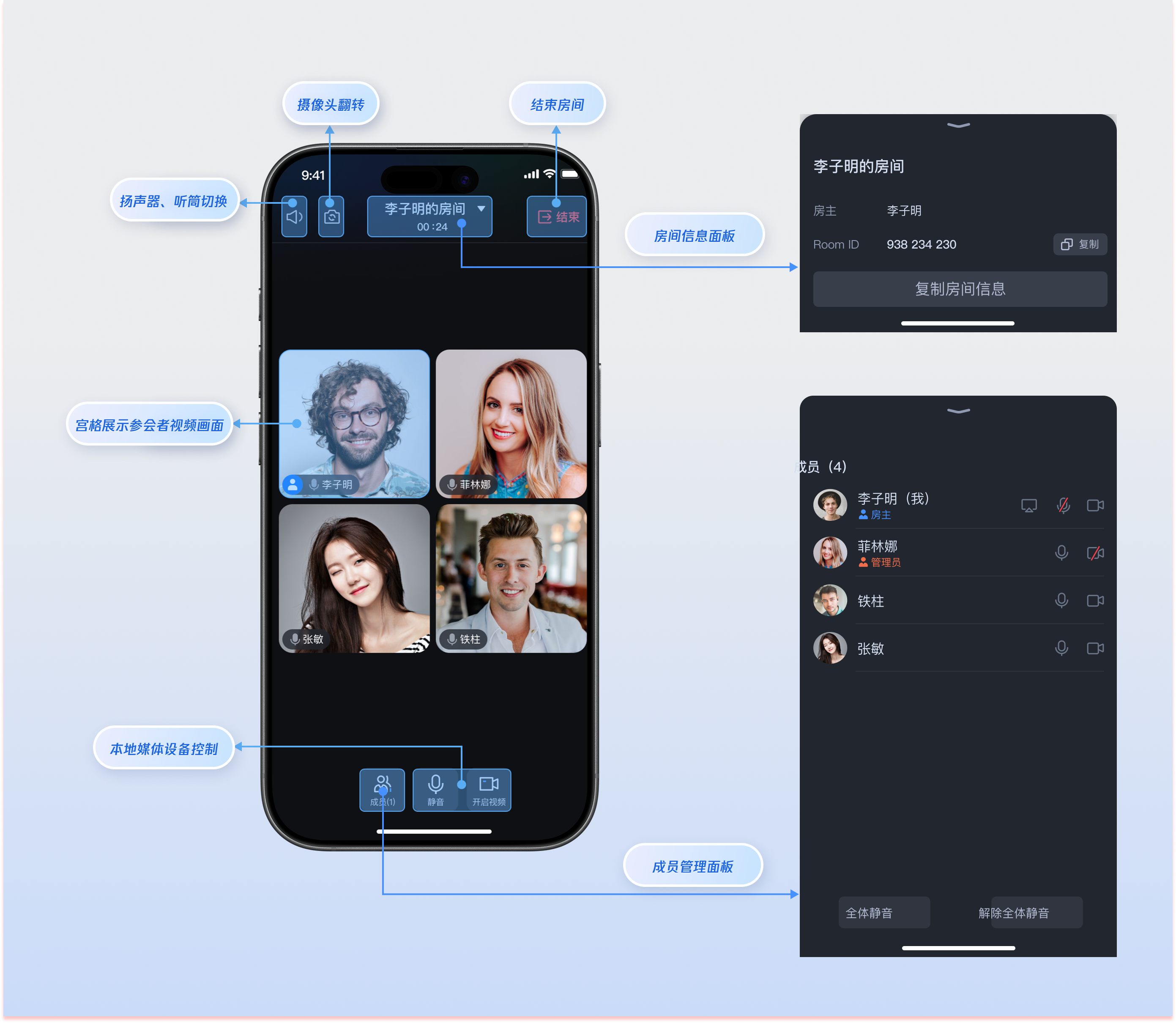 RoomMainView代码后,开发者将得到一个完整的多人音视频页面,内部包含成员管理,音视频设备控制,房间信息展示等功能,这是 TUIRoomKit 组件的核心。