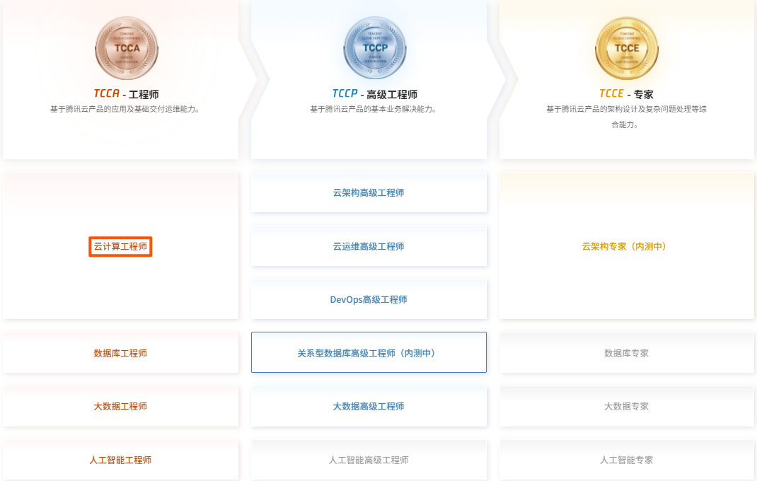 1. 登录 腾讯云培训认证中心,选择认证科目(以报名“云计算工程师”认证为例),单击认证名称。