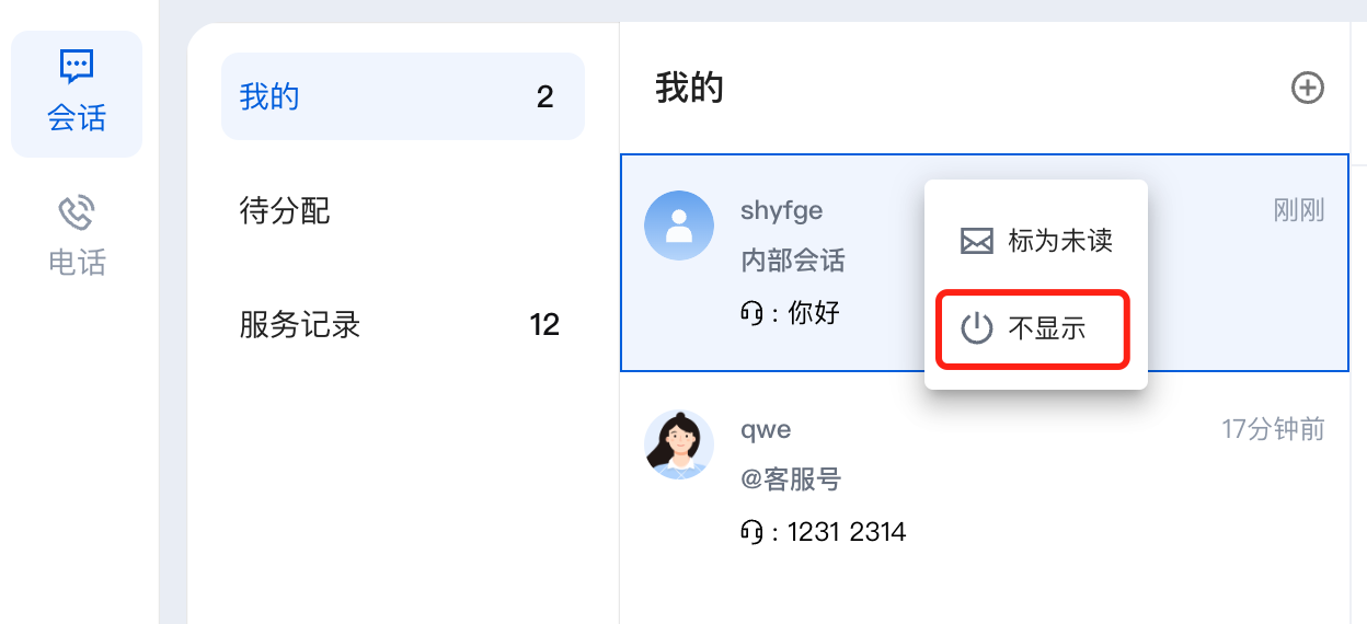如果无需展示沟通完成的内部会话,可以在会话列表中右击会话并选择