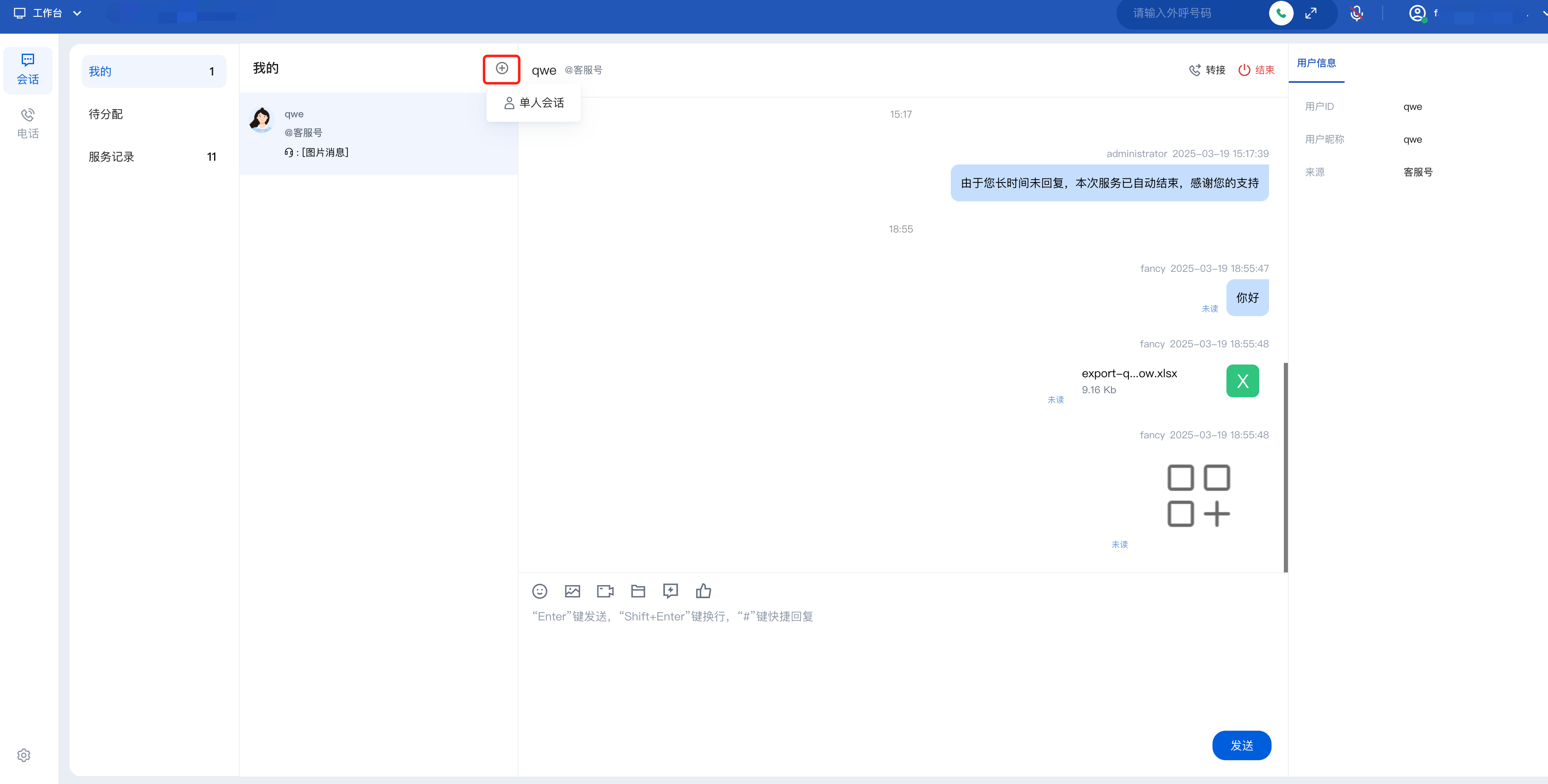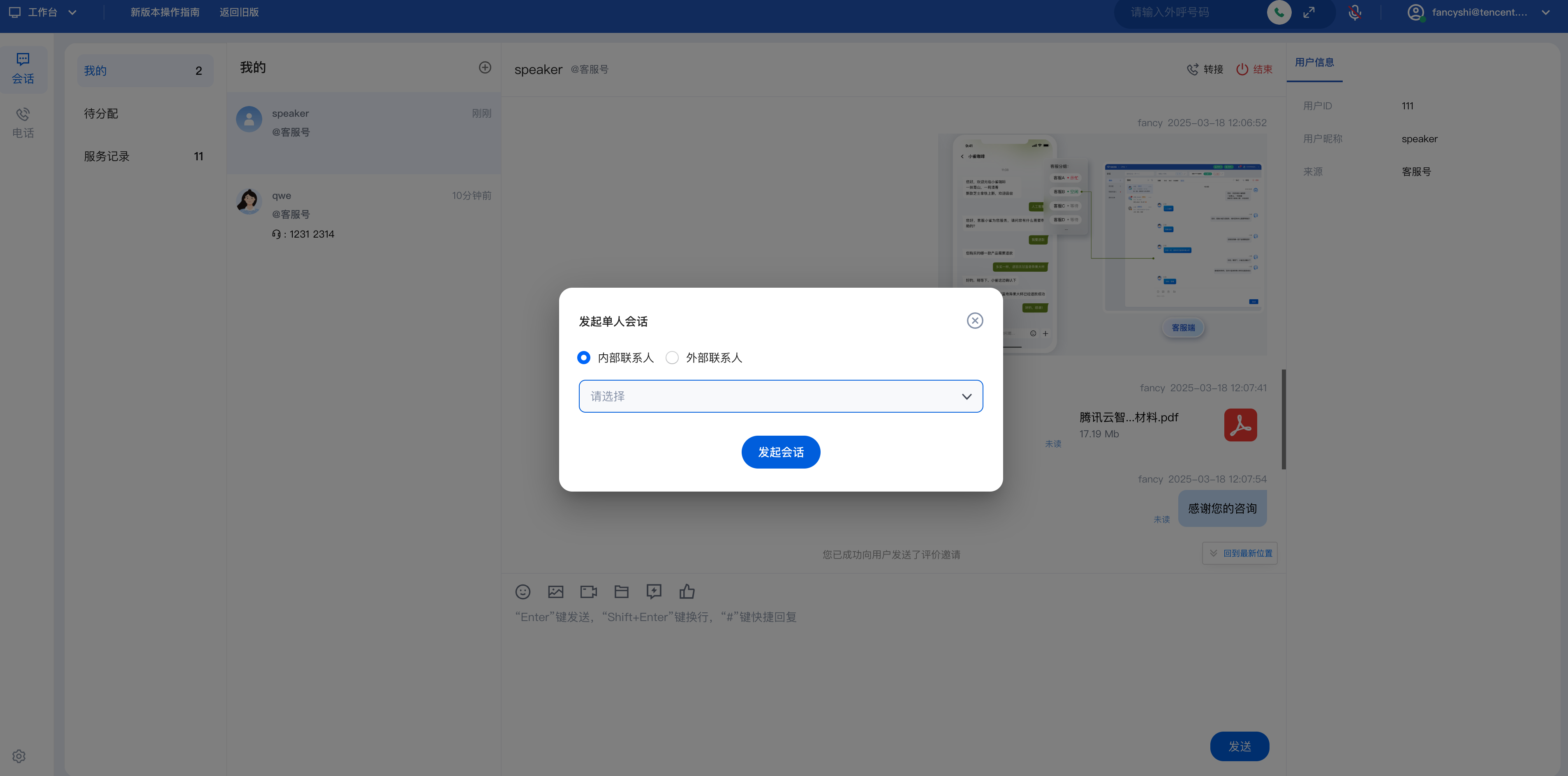 员工之间可发起内部会话,即通过发送文字、图片等方式进行内部沟通。
