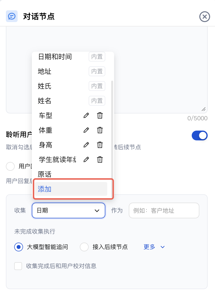 内置收集类型:您可以从下拉菜单中选择需要收集的信息类型,例如 “日期和时间”,并在右侧的文本框中为其指定一个自定义名称,例如 “客户预约时间”。