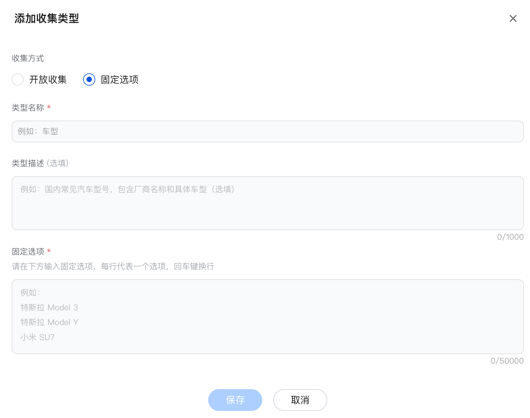 自定义收集类型:可点击添加来新增收集类型。收集类型分两种方式,“开放收集”适合用于收集邮箱、电话号码等无法穷举的信息,“固定选项”适合用于收集车型、城市等可以穷举且需要严格校验的信息。