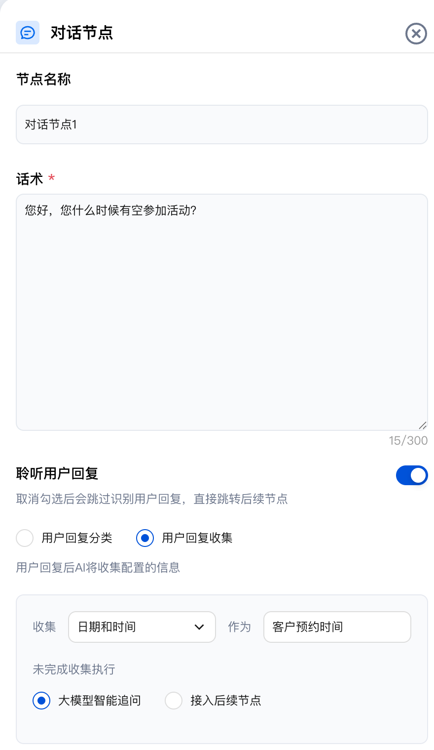 对话节点是智能体与用户交互的核心单元,用于设置提问话术、定义用户回复分类及后续流程跳转逻辑。您可以单击对话节点来添加新节点,在弹窗中填写以下信息: