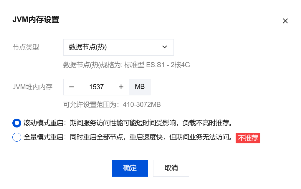 3. 在 JVM 内存设置中,首先选择目标节点类型,然后根据使用场景需求更改 JVM 堆内内存大小,选择重启模式后点击确定执行操作。该功能支持用户选择滚动模式和全量模式两种方式进行重启,推荐使用滚动模式。在滚动模式下,系统会逐个节点进行重启,可以避免同时重启所有节点,减少对服务访问的影响。