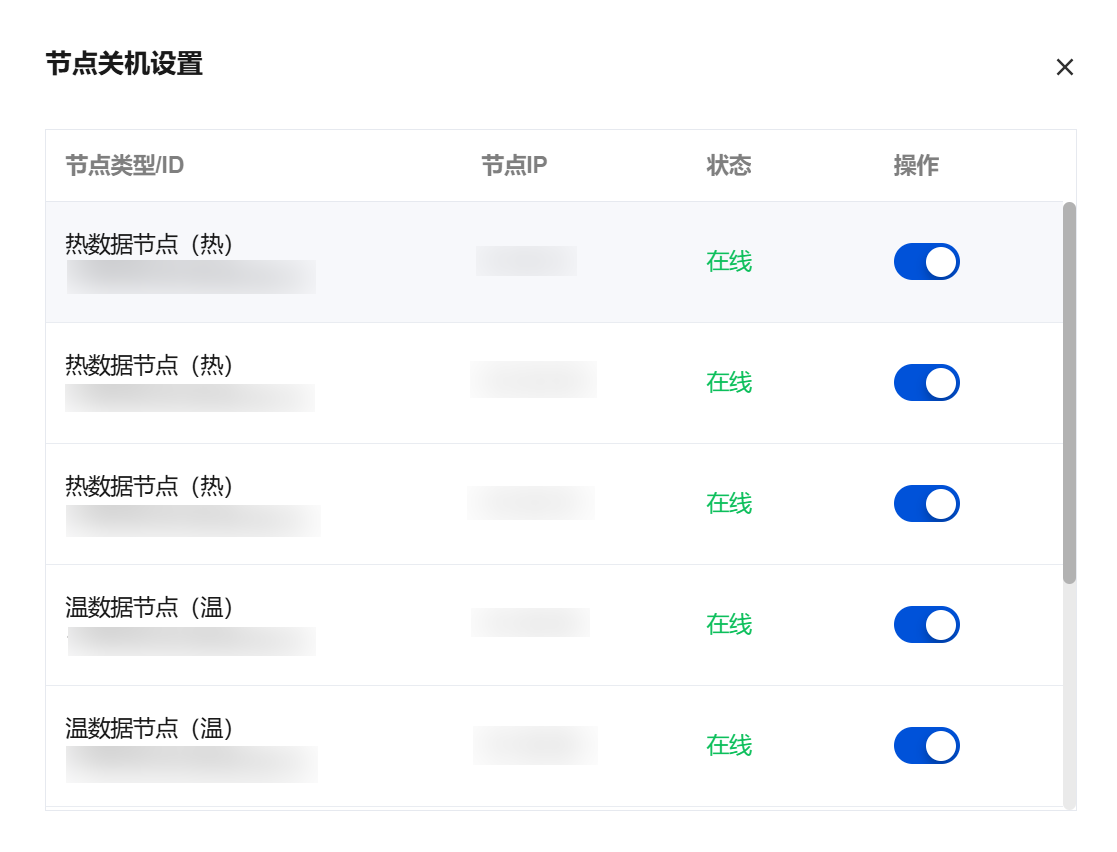3. 在节点关机设置中,针对目标节点点击操作栏按钮即可执行关机或开机操作。若集群未设置副本,则关机操作会导致集群状态 RED ,建议设置副本后再执行关机操作。