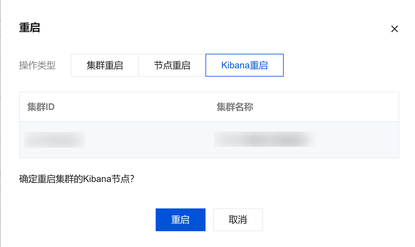 :在确认 Kibana 节点对应的集群 ID 及名称后,单击重启,集群状态变为处理中,等待集群状态恢复为正常,重启操作即完成。