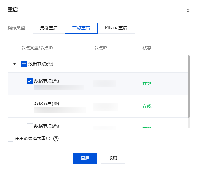 :在勾选待重启的节点后,然后单击重启,集群状态变为处理中,等待集群状态恢复为正常,重启操作即完成。用户可选择是否使用蓝绿模式进行重启,但该模式将会导致节点 IP 地址更改,需谨慎选择。