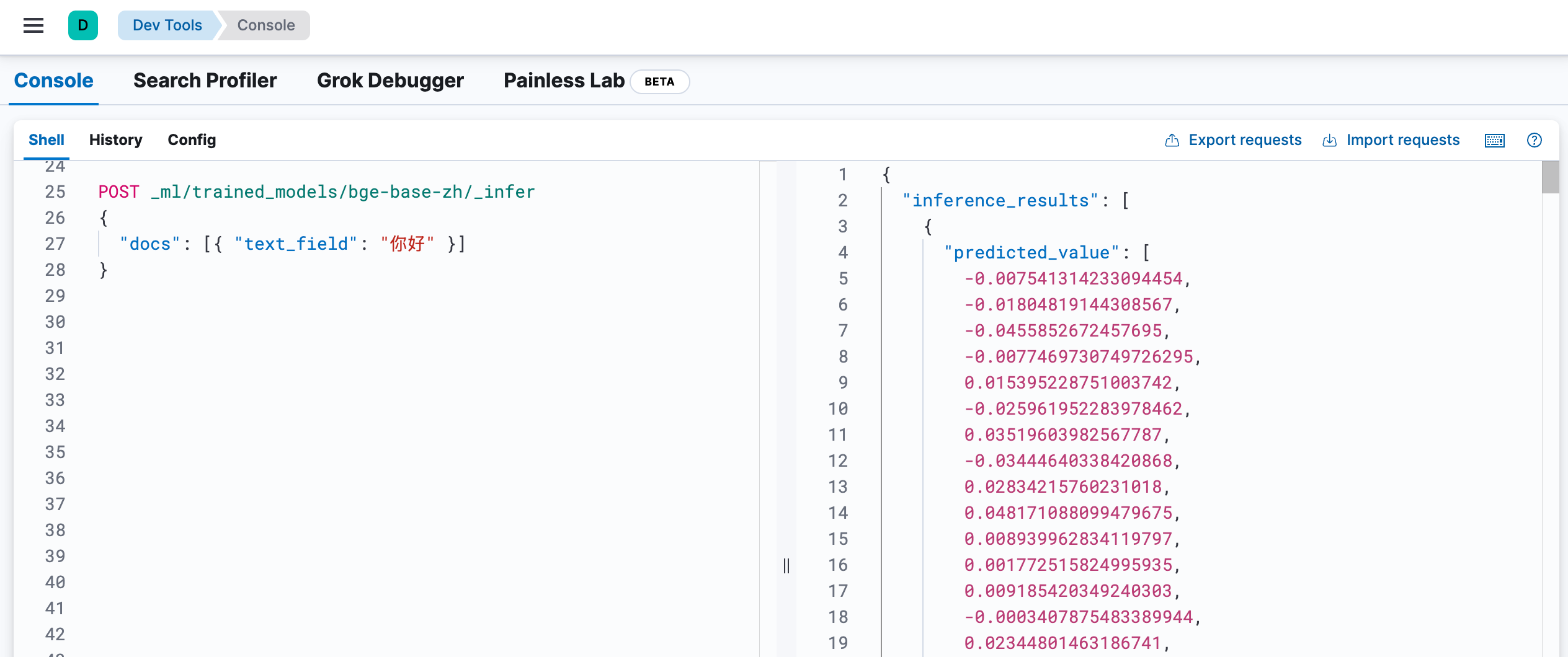 POST _ml/trained_models/bge-base-zh/_infer{"docs": [{ "text_field": "你好" }]}