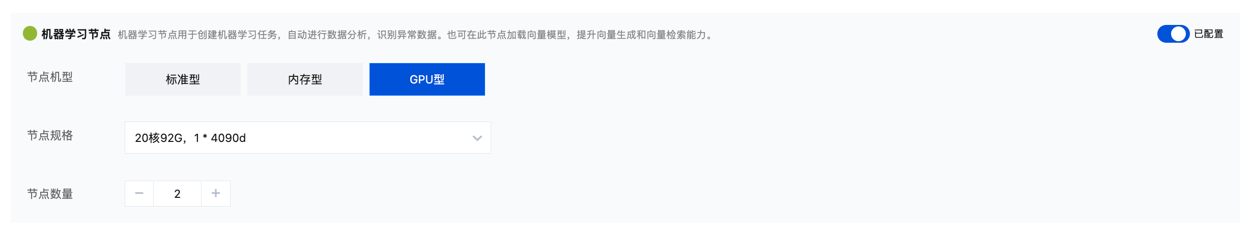 如果您尚未创建ES集群,可以在创建集群时开启“机器学习节点”,如果您已经创建了ES集群,可以通过“调整配置”开启“机器学习节点”。