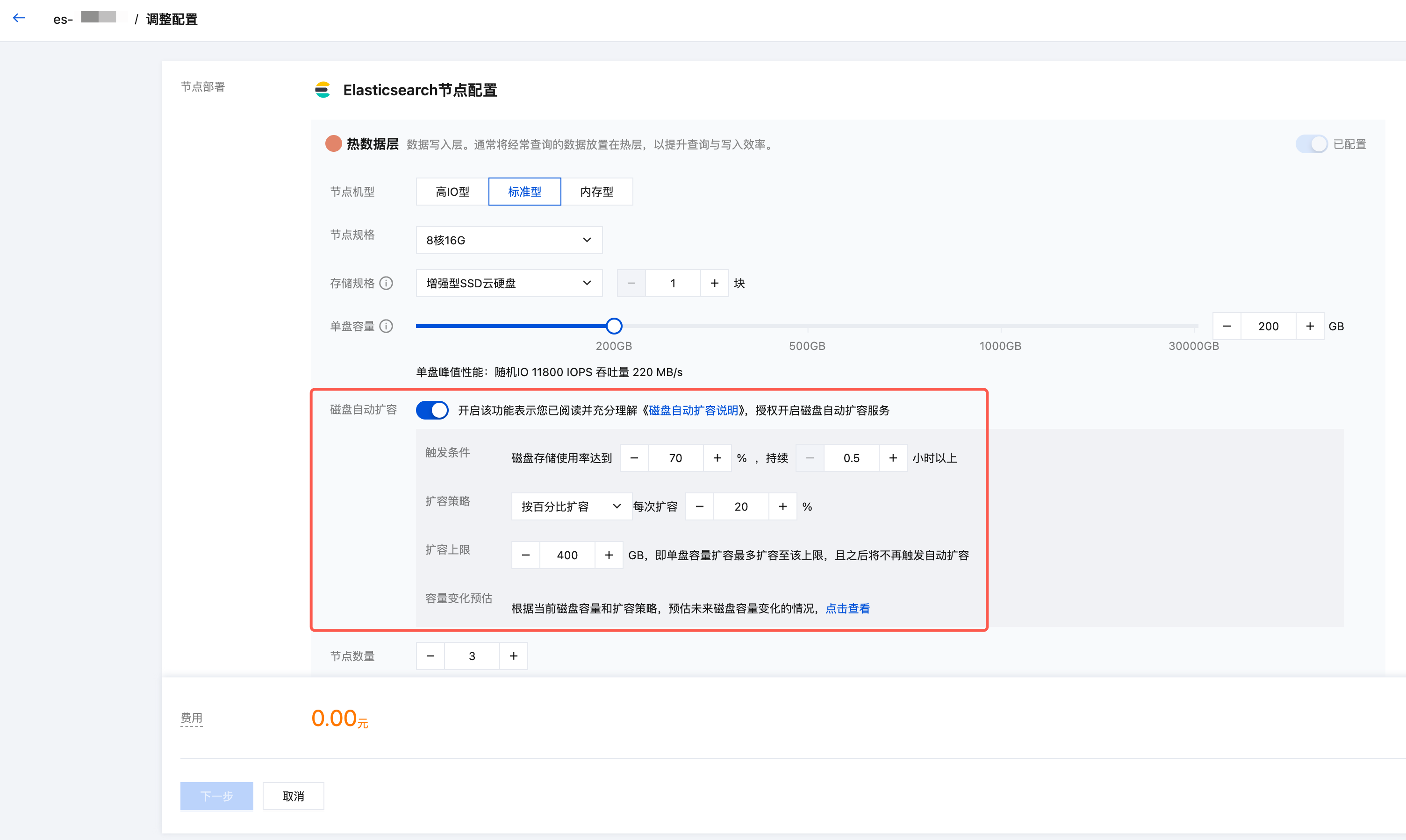 余额保障:对于包年包月计费模式的集群,自动扩容会立即产生费用并尝试扣费。若账户余额不足,将导致扩容失败。请确保账户余额充足。