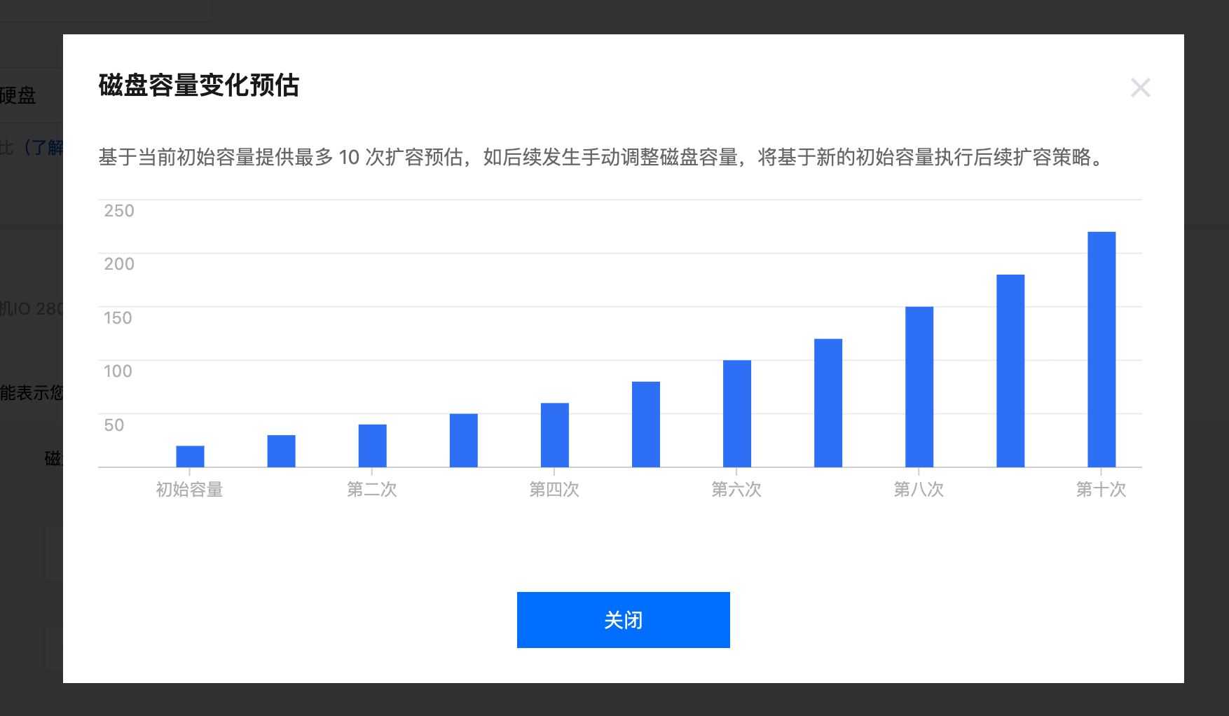 根据您设置的扩容策略,系统可根据您设置的当前初始容量、扩容策略和扩容上限,模拟预估最多10次自动扩容后的磁盘容量变化情况。