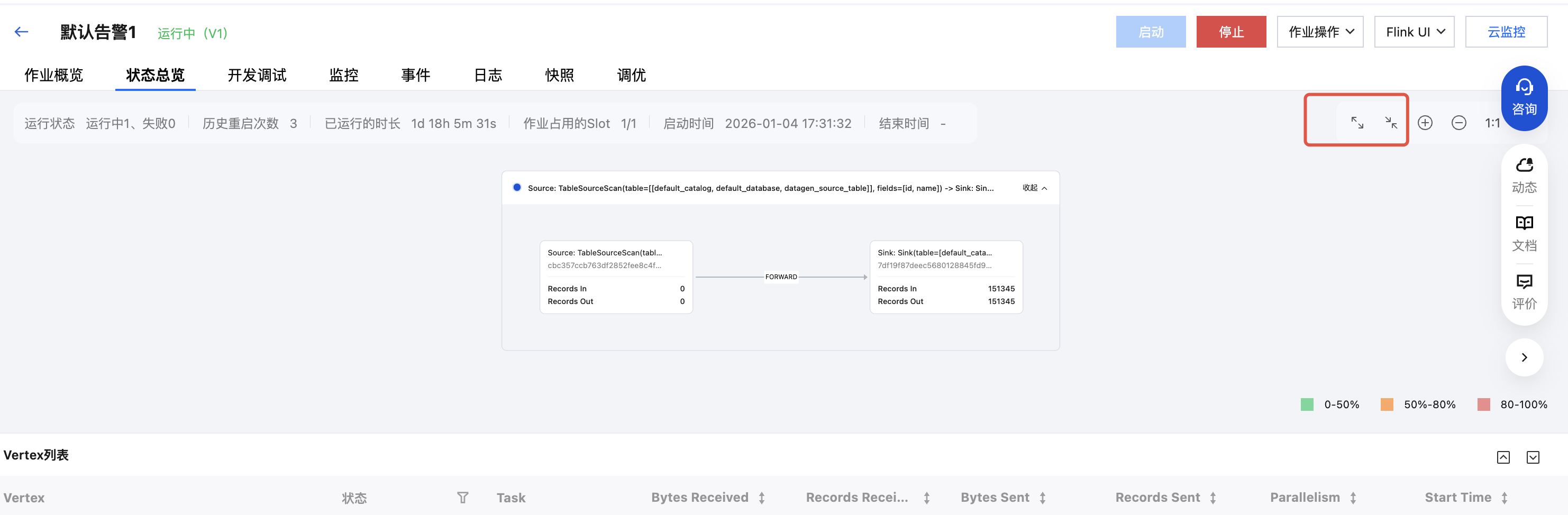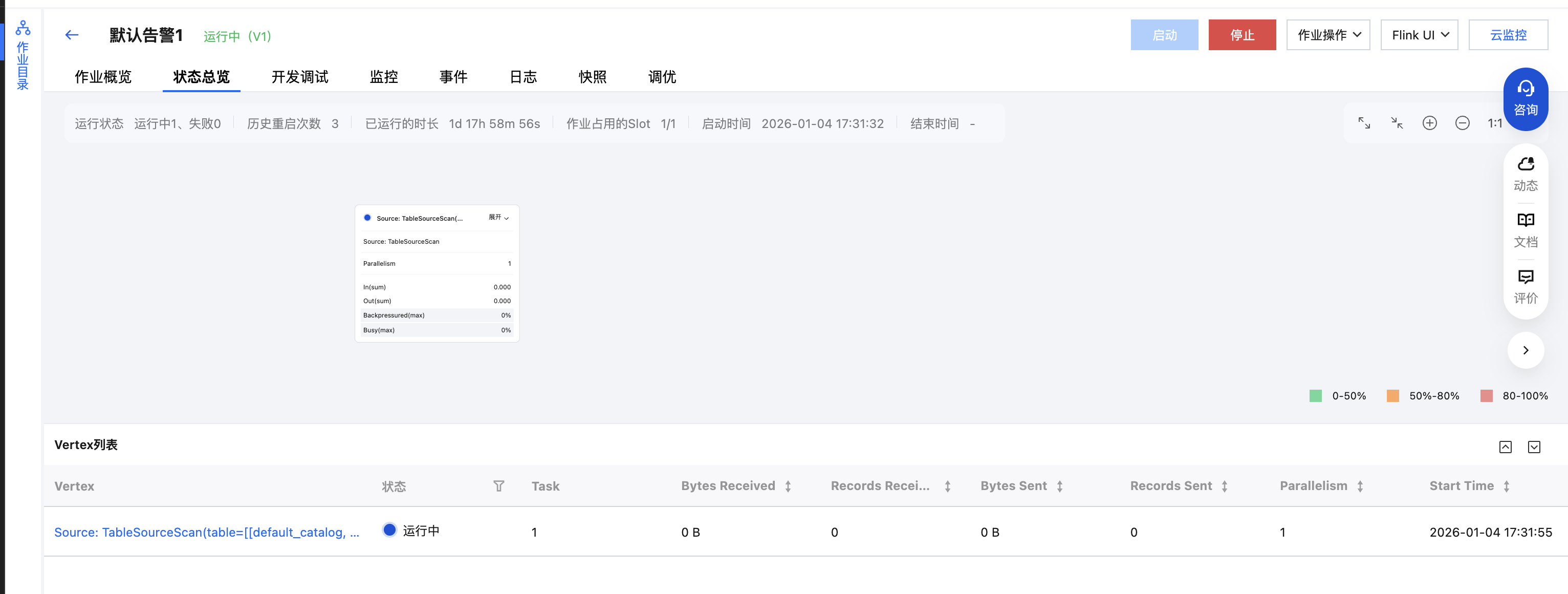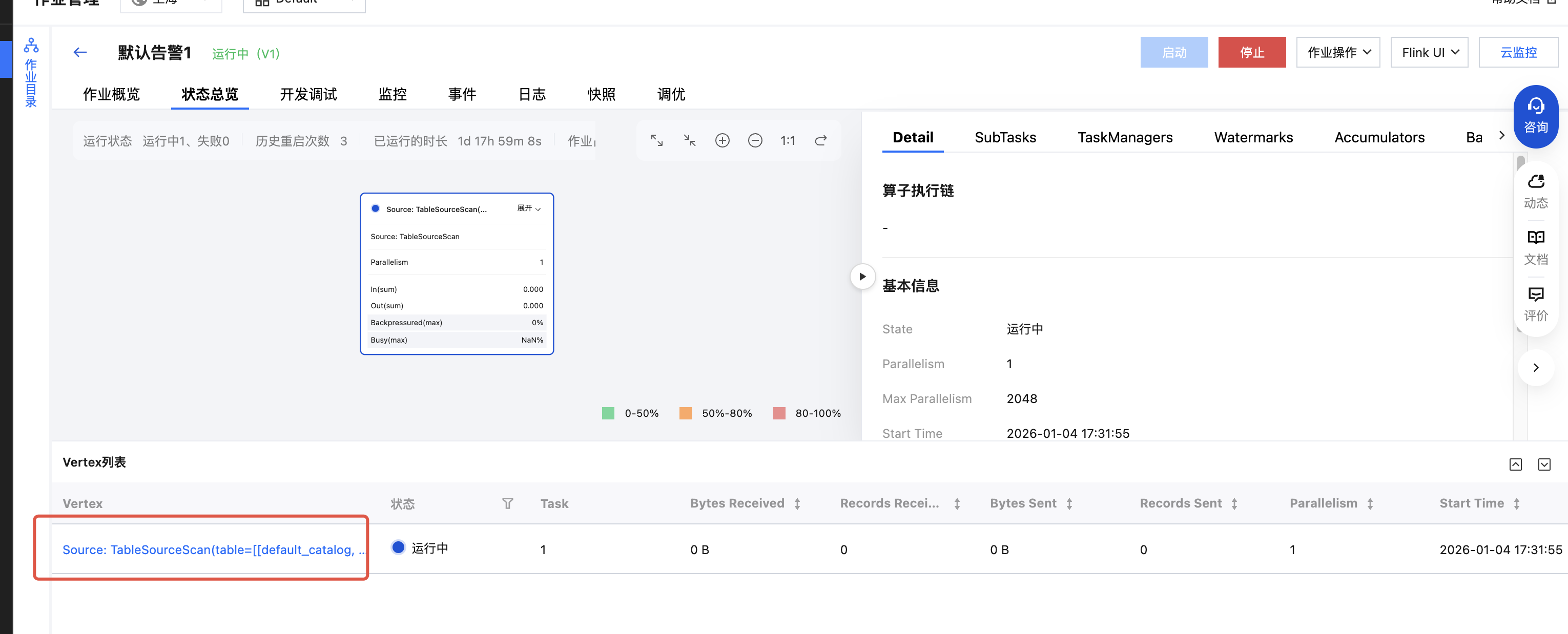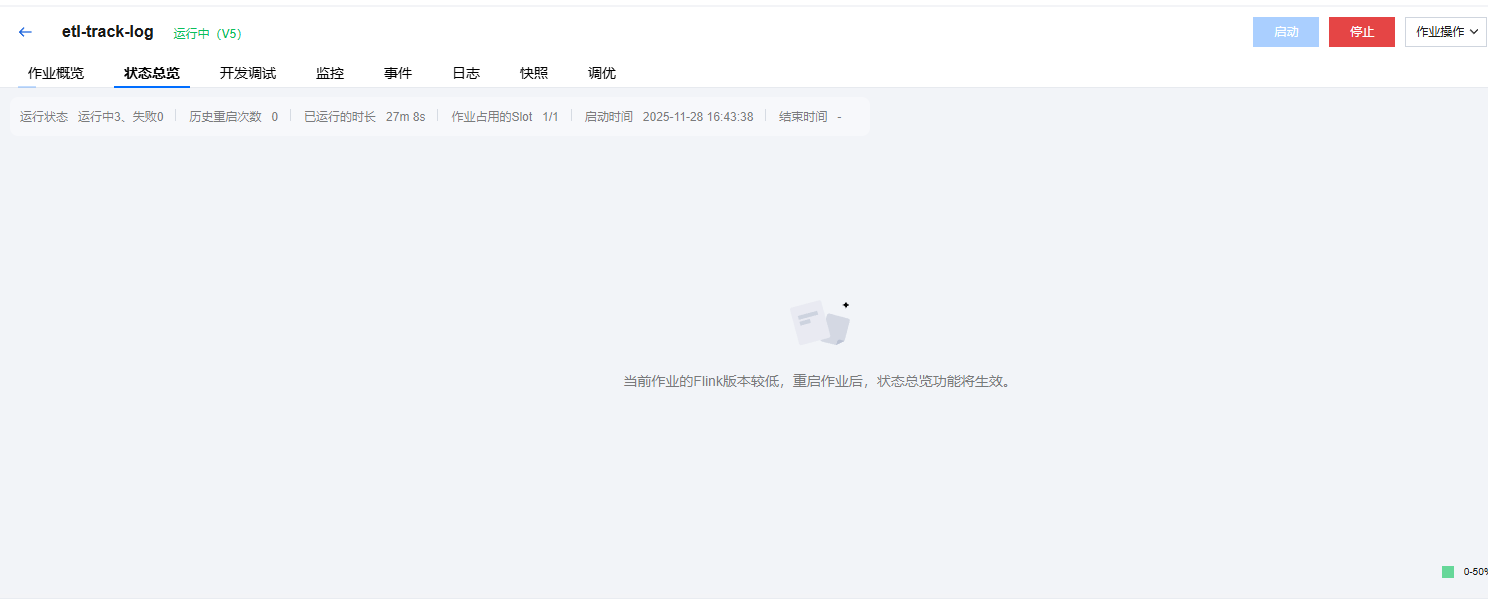 正常的状态总览如下图所示,可以显示作业的运行状态、重启次数、运行时长以及作业的一些指标。