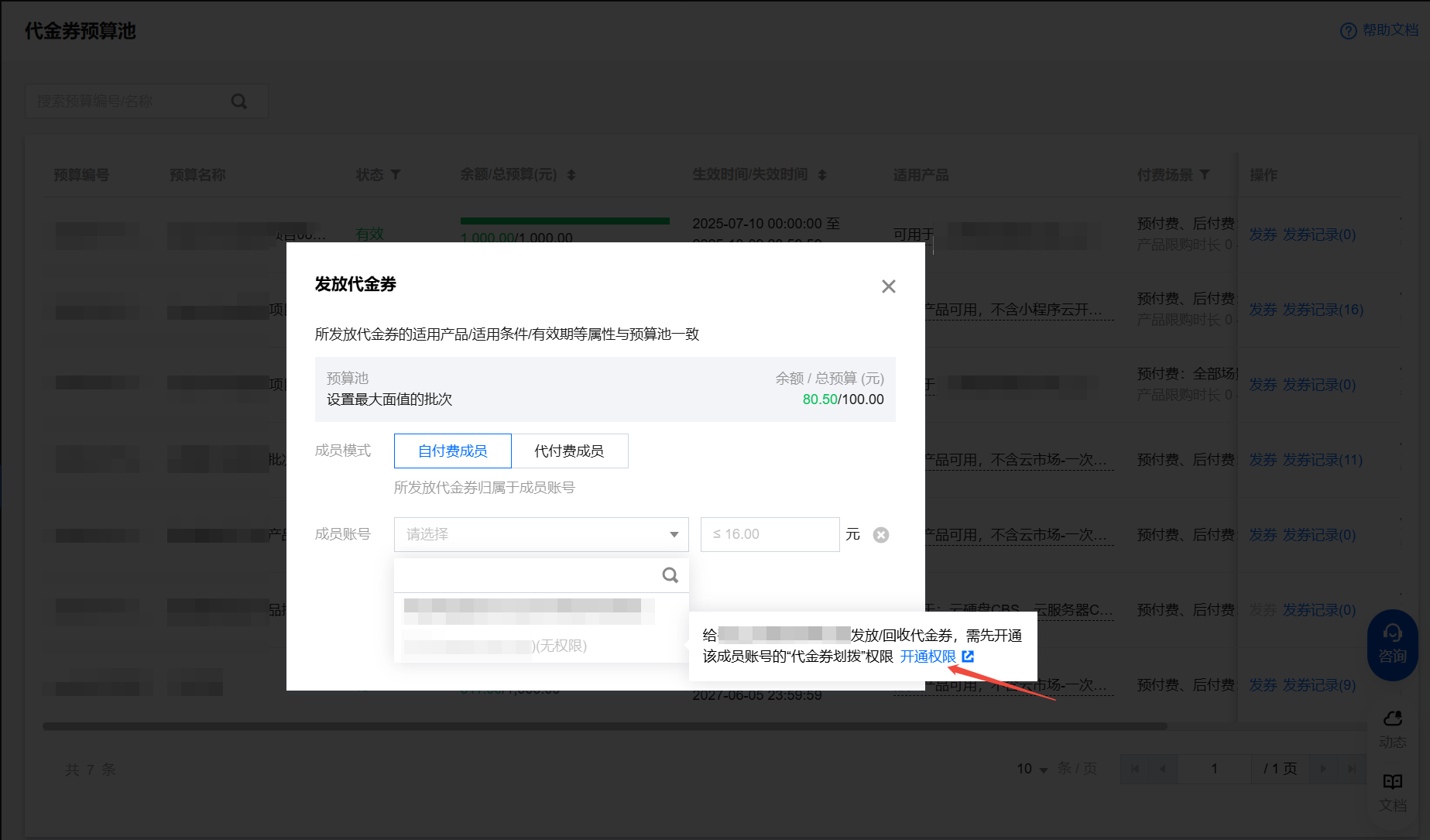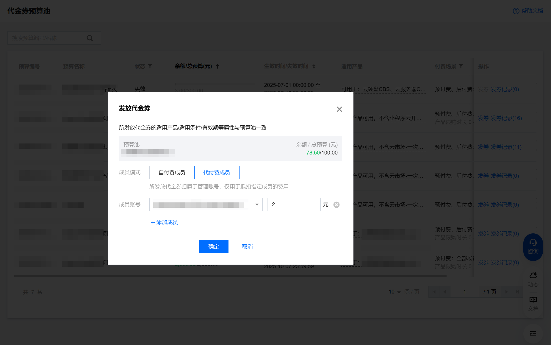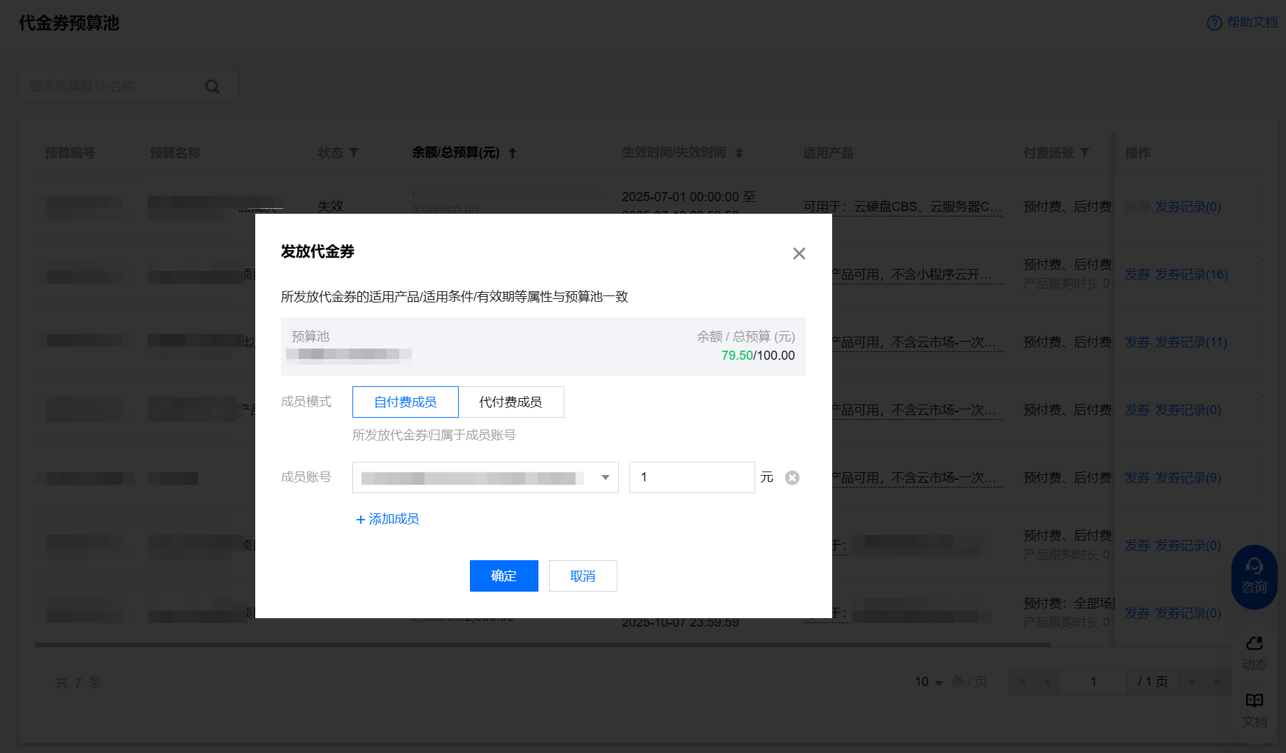 选择预算池,单击发券,在发放代金券页面中,选择自付费成员模式,下拉选择成员,输入代金券面额,单击确定即可。