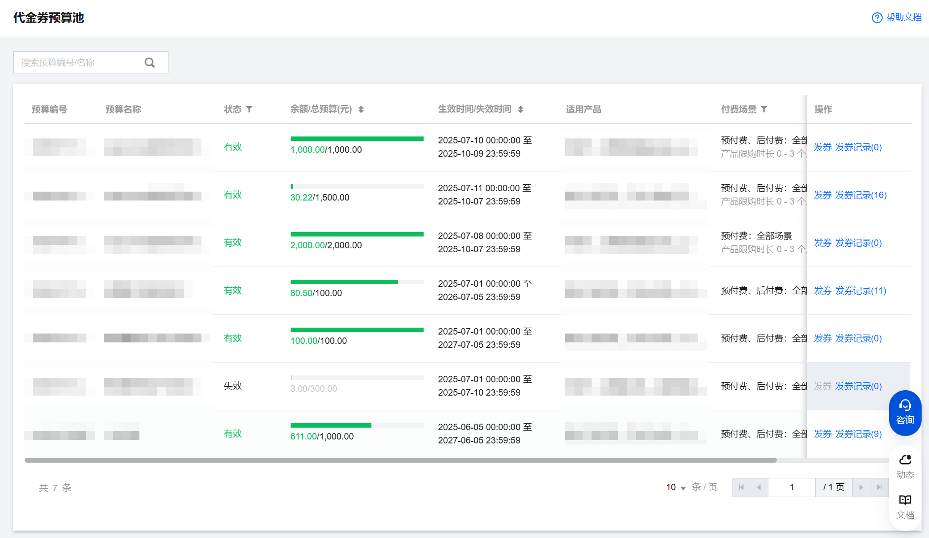 单击各预算池中的发券记录,可以查看预算池的发放和回收记录。