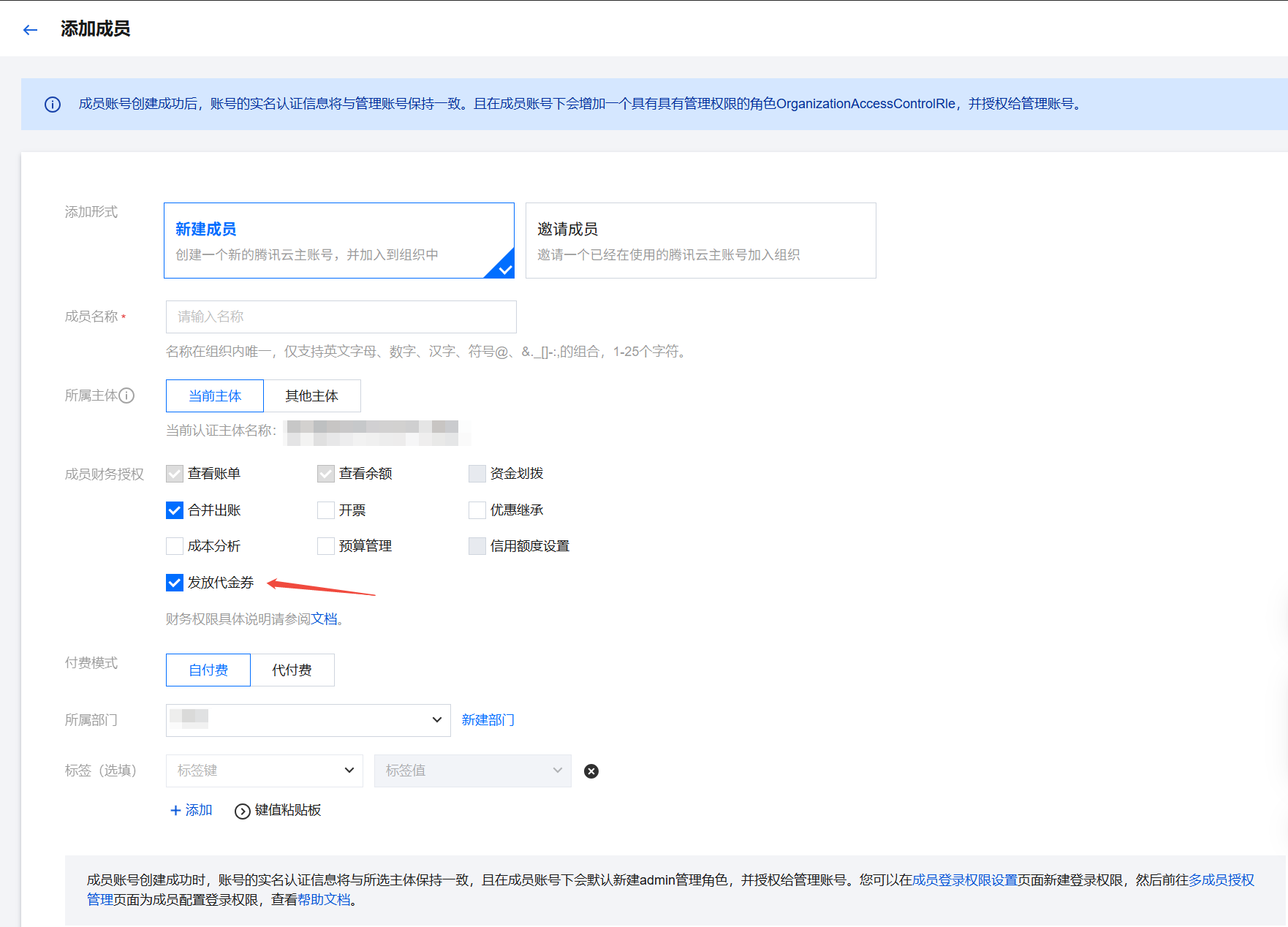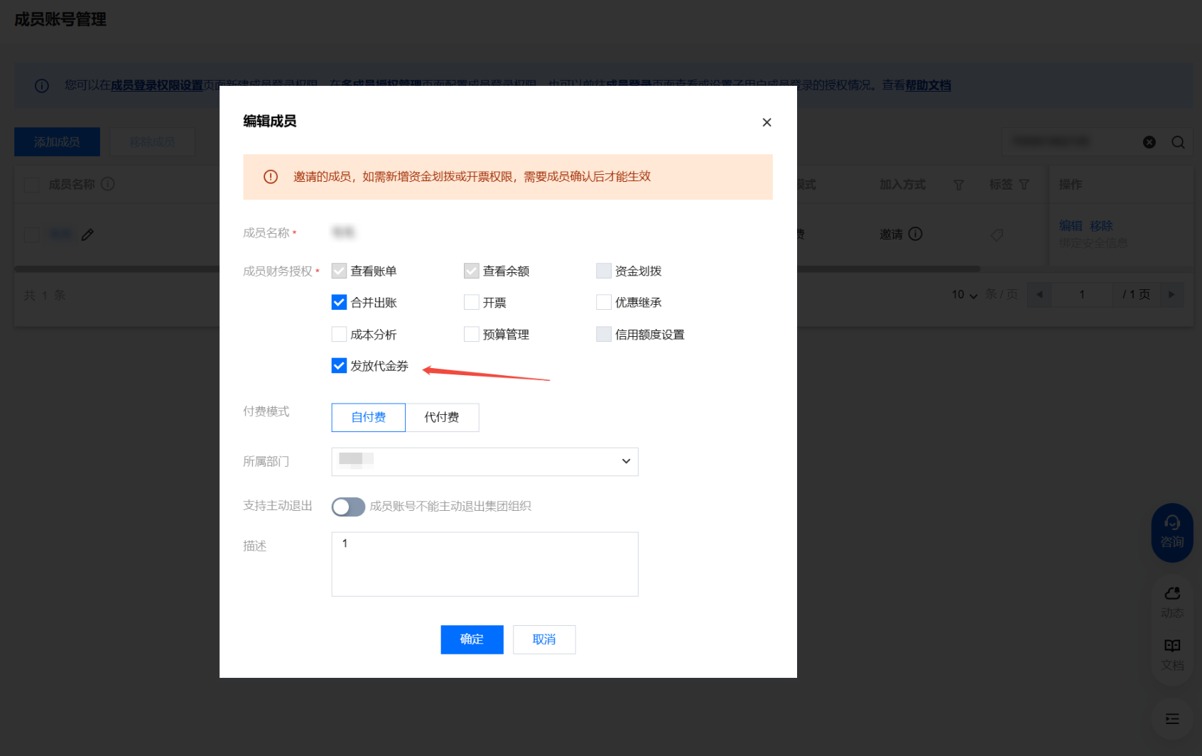 创建或邀请新成员时,为成员选择发放代金券权限。详情请参见 添加组织成员。