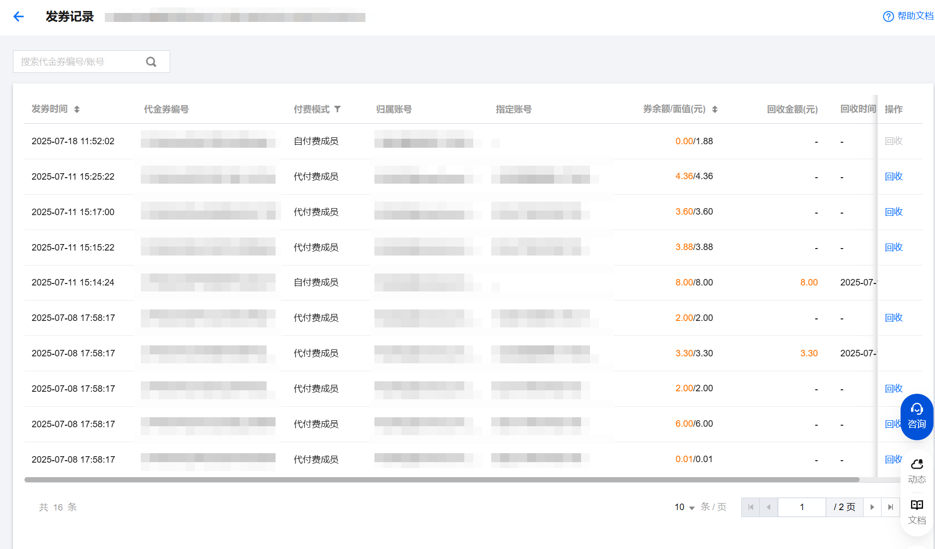 代付费成员模式,代金券发放至管理账号中,管理账号通过“代金券”列表查看。