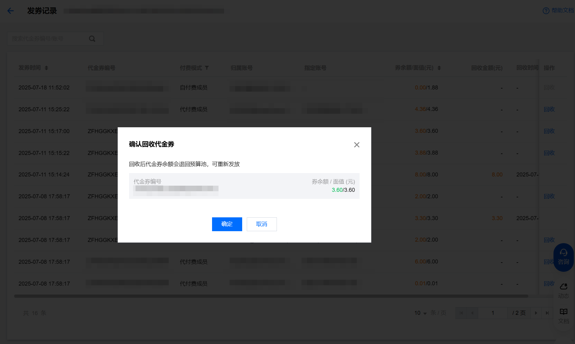 在发券记录中,单击回收,在弹出的窗口中,单击确定,则作废回收此代金券,代金券余额退回到预算池,可进行二次发放。以下情况不能回收: