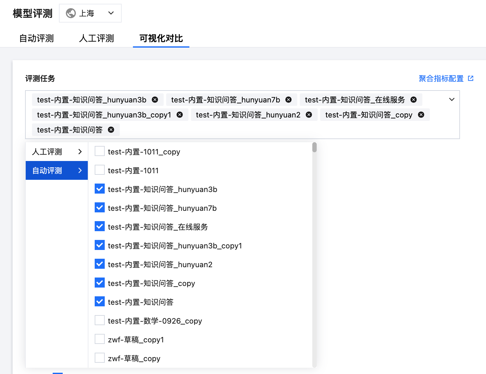 选择评测任务时,支持多选。如果选中包含“某模型评测某评测集”的多个评测任务,那么此模型在此评测集上的评测指标的值会做均值处理。
