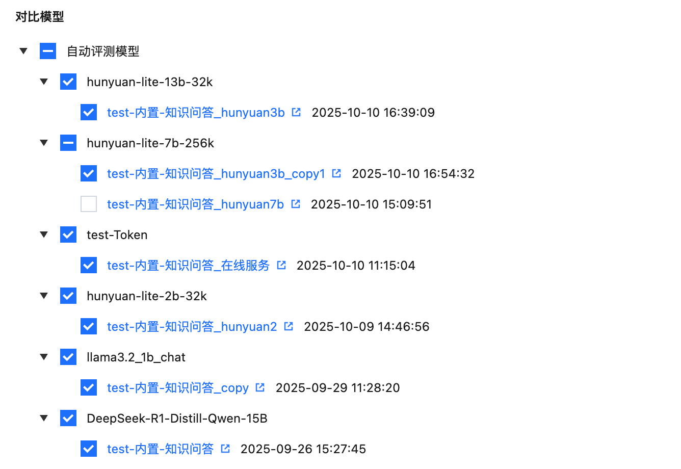 2. 选完评测任务,会自动出现选中评测任务使用的评测数据集和评测的模型,数据集和模型默认全选,也可勾选去除。此模型相关的评测任务会按最新评测时间进行罗列,用户可选择相关的评测任务。如下图: