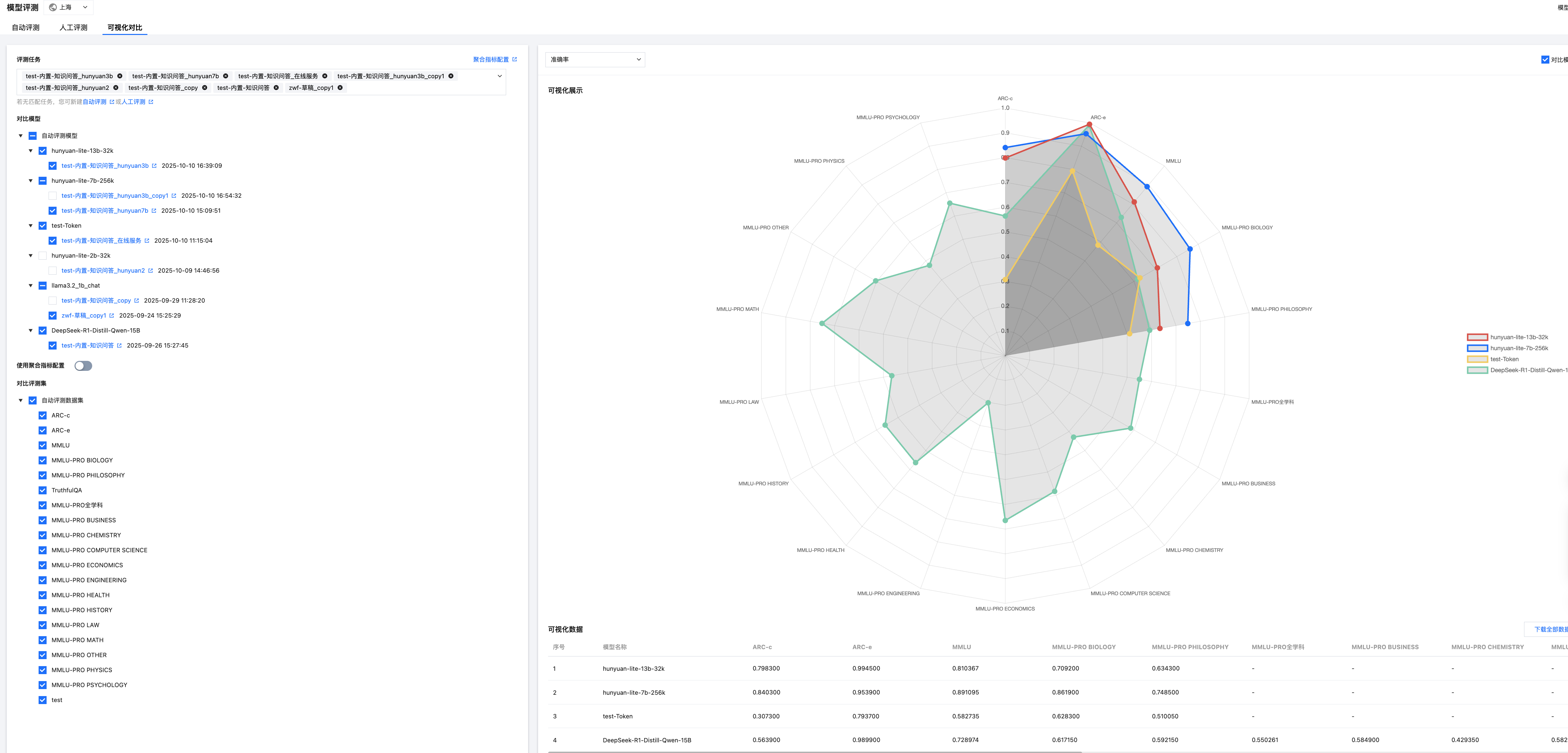 评测可视化对比提供对不同模型通过雷达图直观的展示指标对比效果,可直接基于已完成的自动评测、人工评测的评测指标快速进行选择和对比,也可通过配置聚合指标后,对不同模型在相同聚合指标进行效果对比,其功能的详细描述为:
