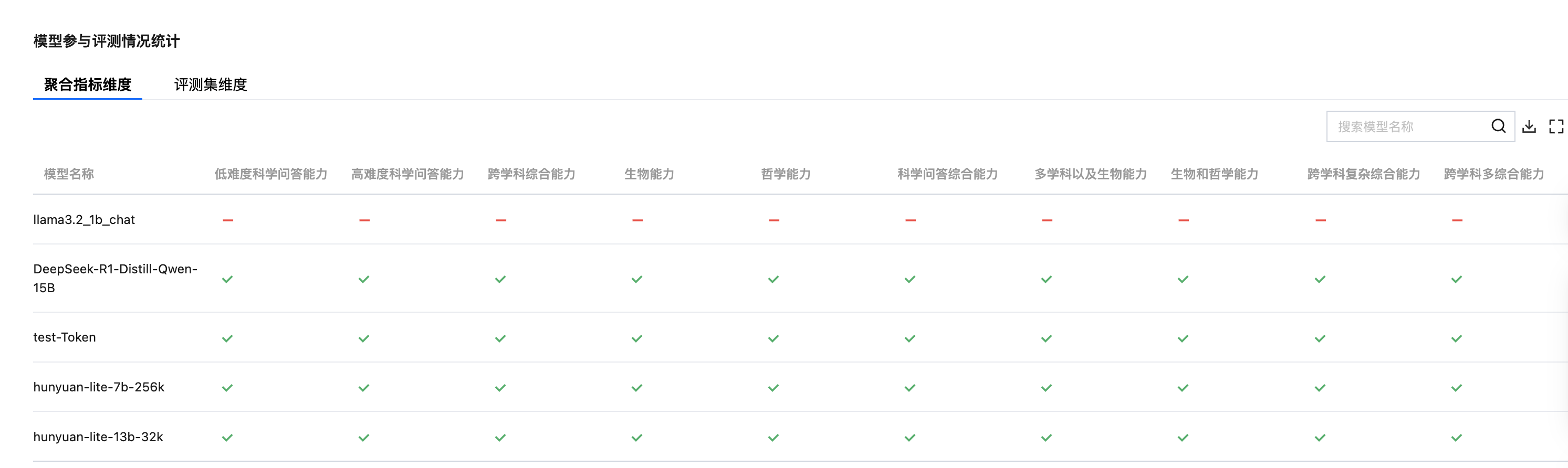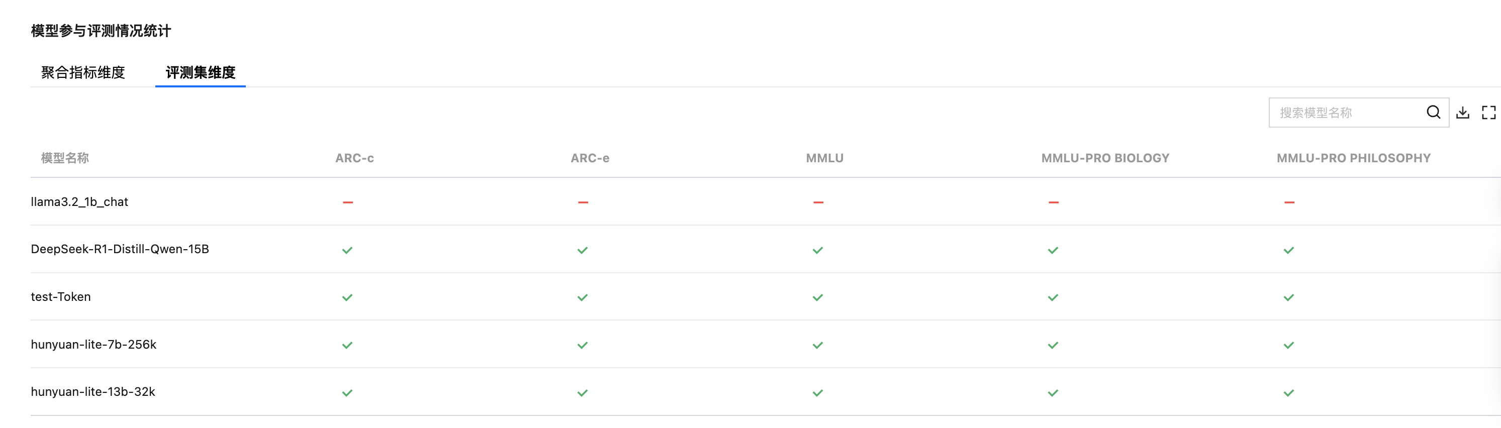 支持统计模型参与评测的情况,从聚合指标维度和评测集维度进行统计,方便用户直观查看模型是否在重点评测集已完成过评测。