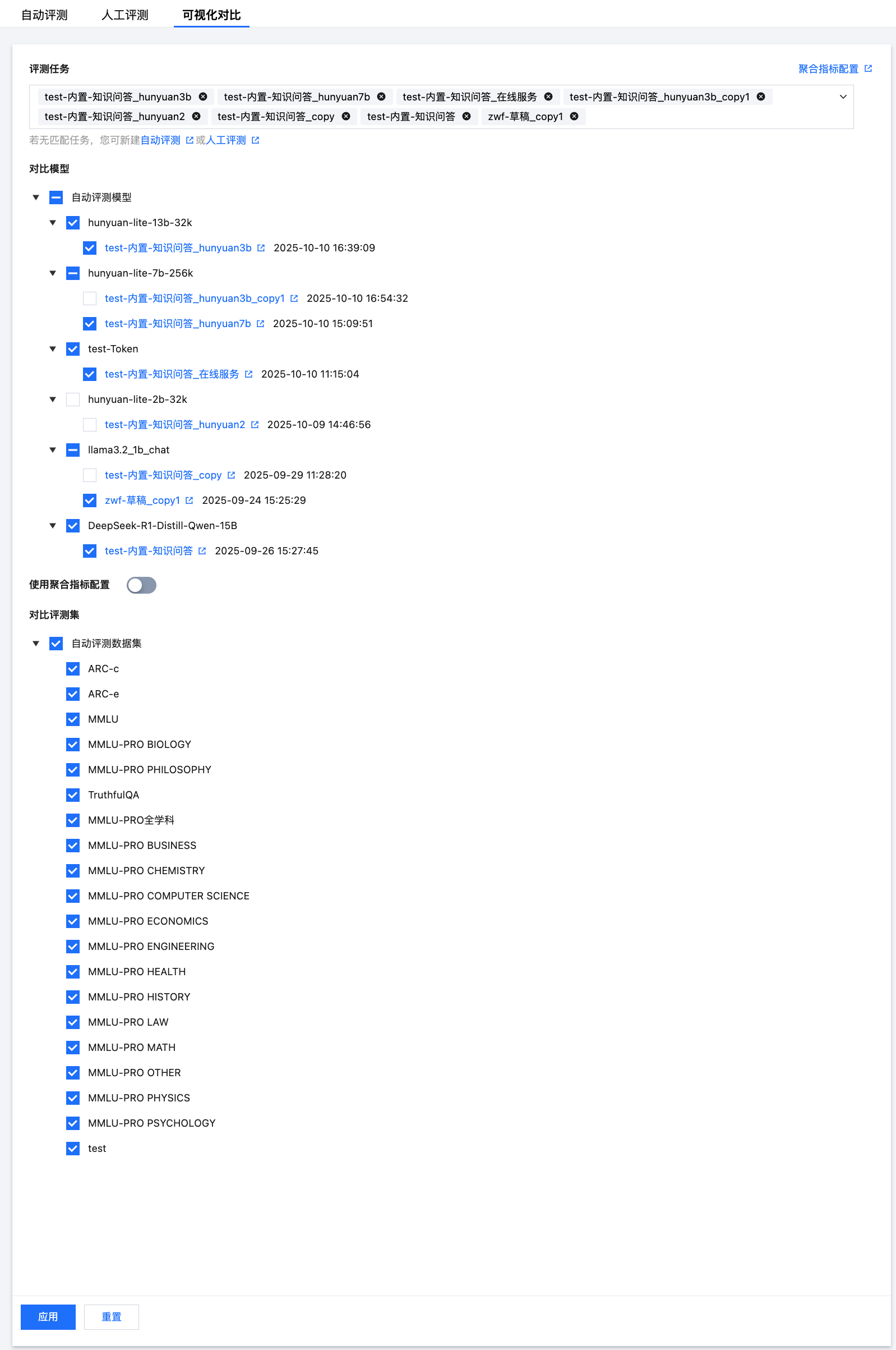 3. 如需重新选择评测任务、对比数据集、对比模型,选择好后,单击应用,右侧图表会根据最新选择更新,否则每次进入该页面均按照上次提交“应用”的配置展示。