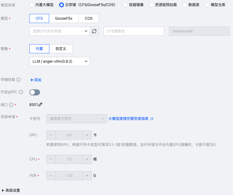 用户通过 TI 平台部署并通过内置推理加速镜像 Angel-vLLM 使用自有模型,首先需要准备如下资源(包含存储模型等文件的 CFS 以及推理模型使用的算力资源 GPU 等)。