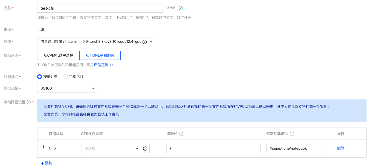 机器来源:若您先前没有购买任何算力资源,可选择从 TIONE 平台购买按量计费模式,若您需要从 CVM 机器中选择或包年包月,请参考前置条件中算力资源自行购买。