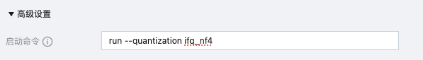 启动命令指定:高级设置 > 启动命令用法,例如使用 ifq_nf4 的量化,示例如下(若需要调整其他参数,请参考下文服务部署参数):